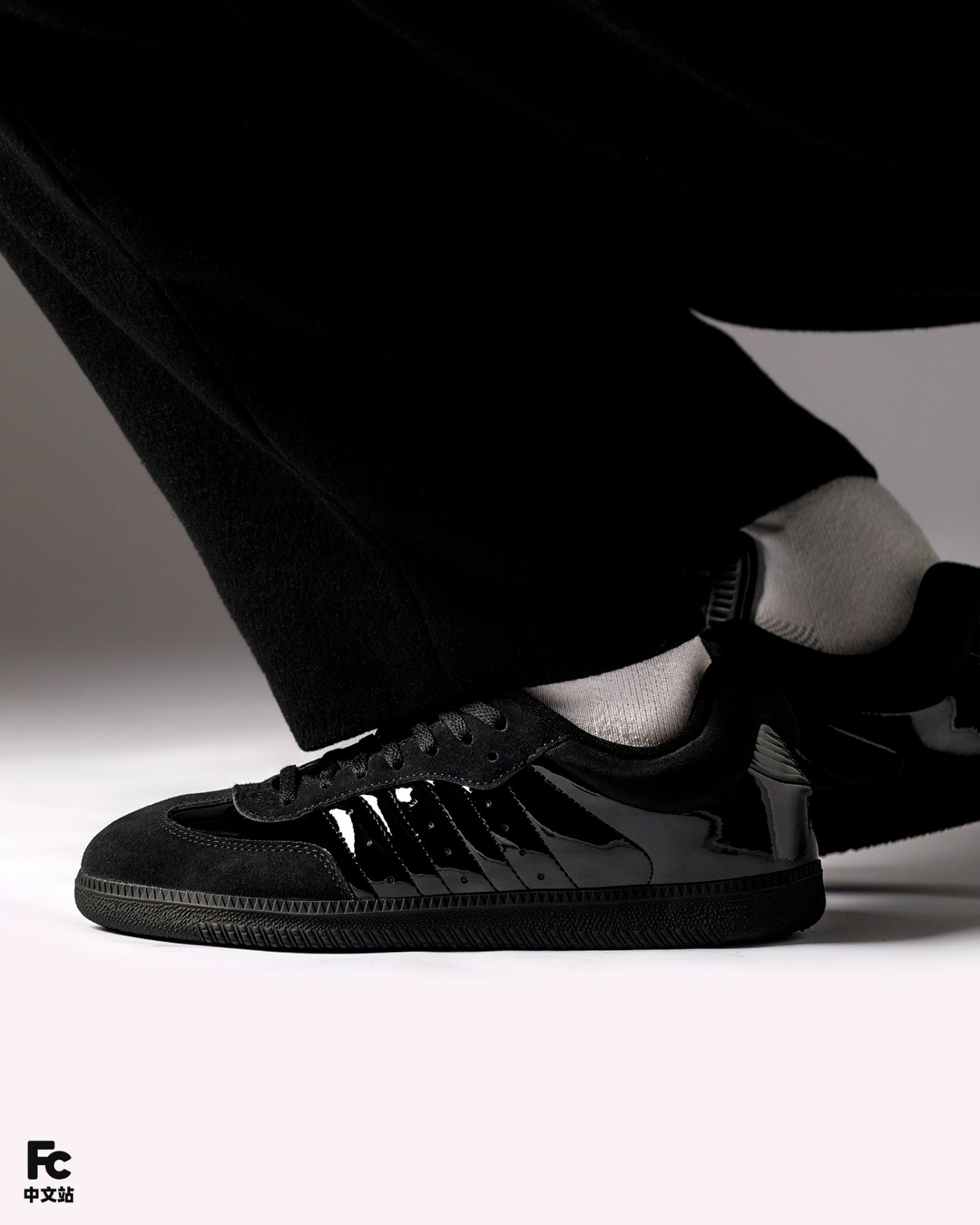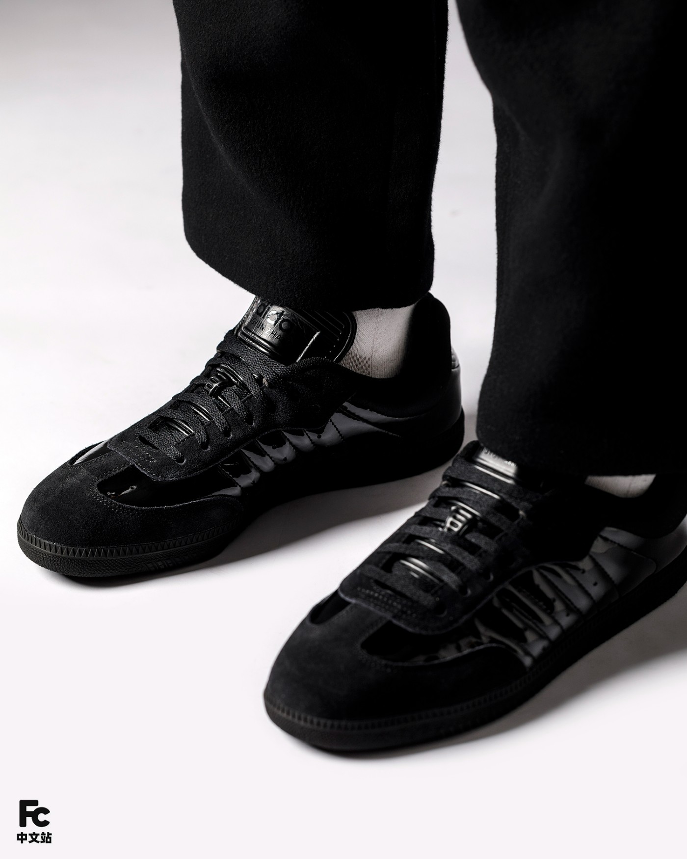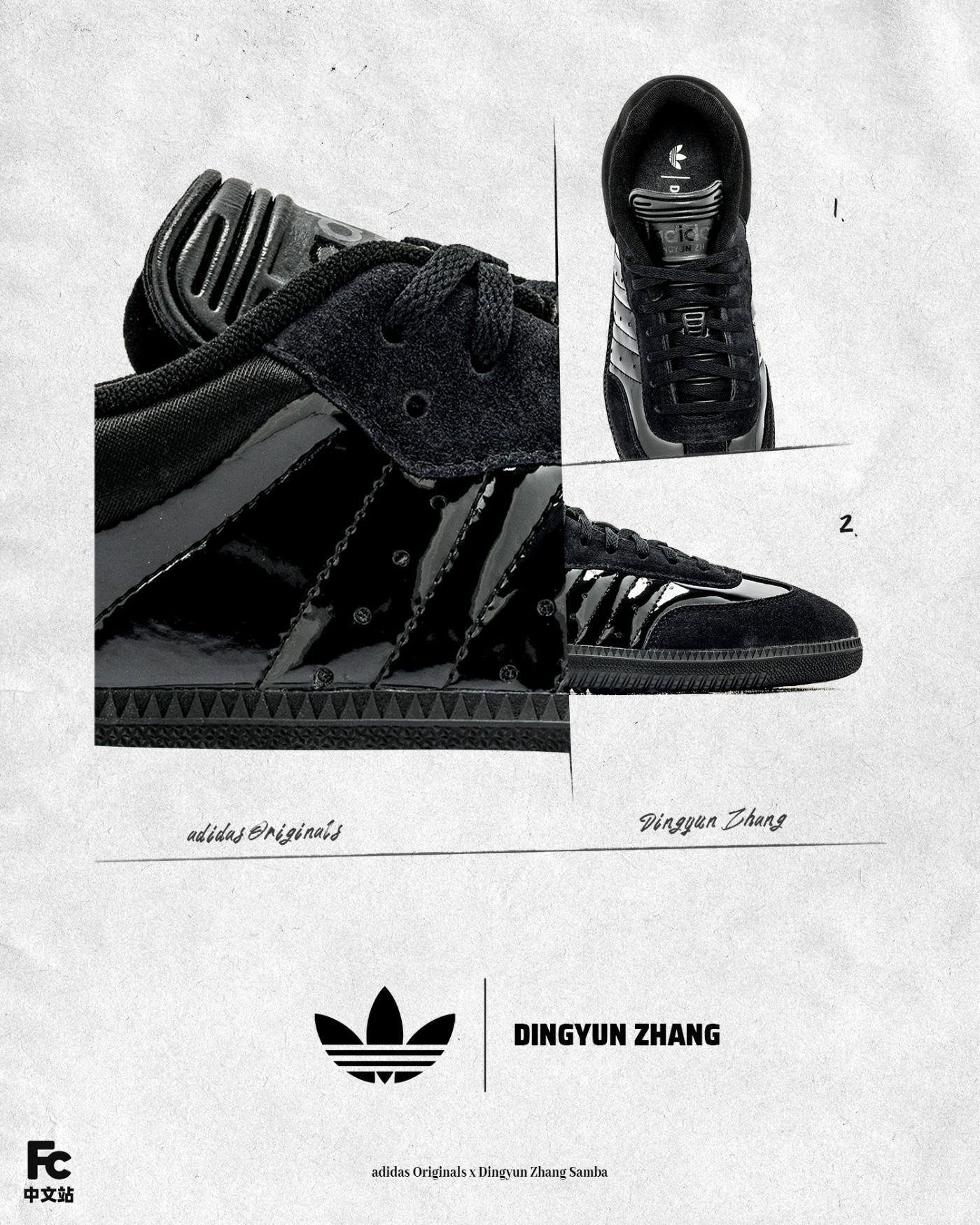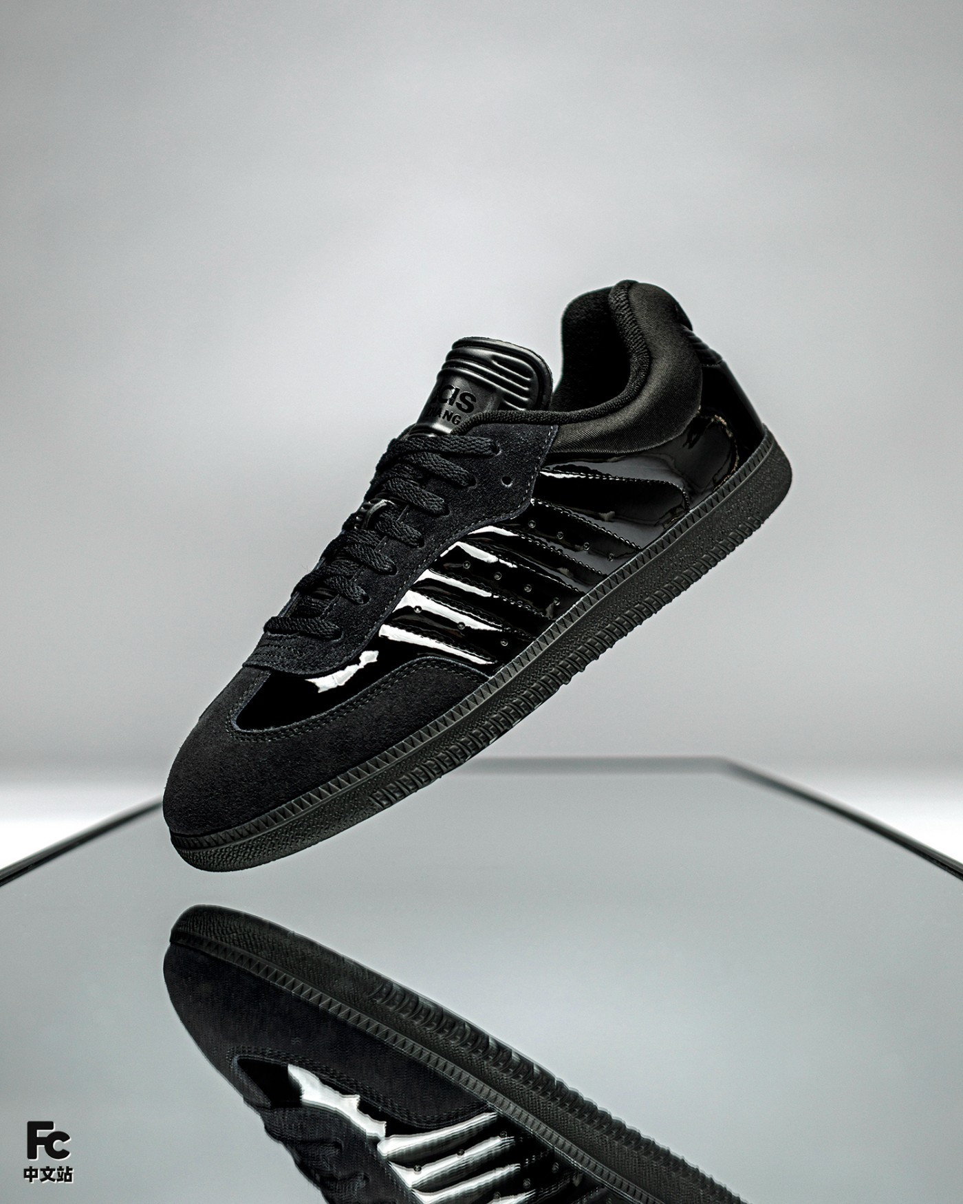 全鞋以纯黑色呈现,是张鼎昀 Dingyun Zhang 对于学生时代的致敬和怀念,上学时为了符合学校的校服着装规范,他曾将自己的 Samba 涂成黑色。