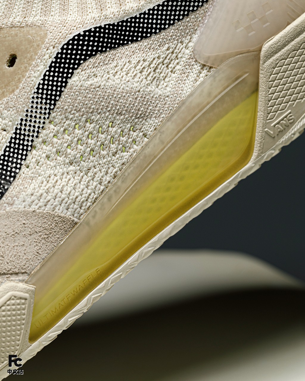 Vans 滑板鞋标志性的侧边条纹以黑色呈现,其上疏密不一的波点与针织鞋面纹理相互呼应,很好的平衡了经典造型传承和最新科技风格。