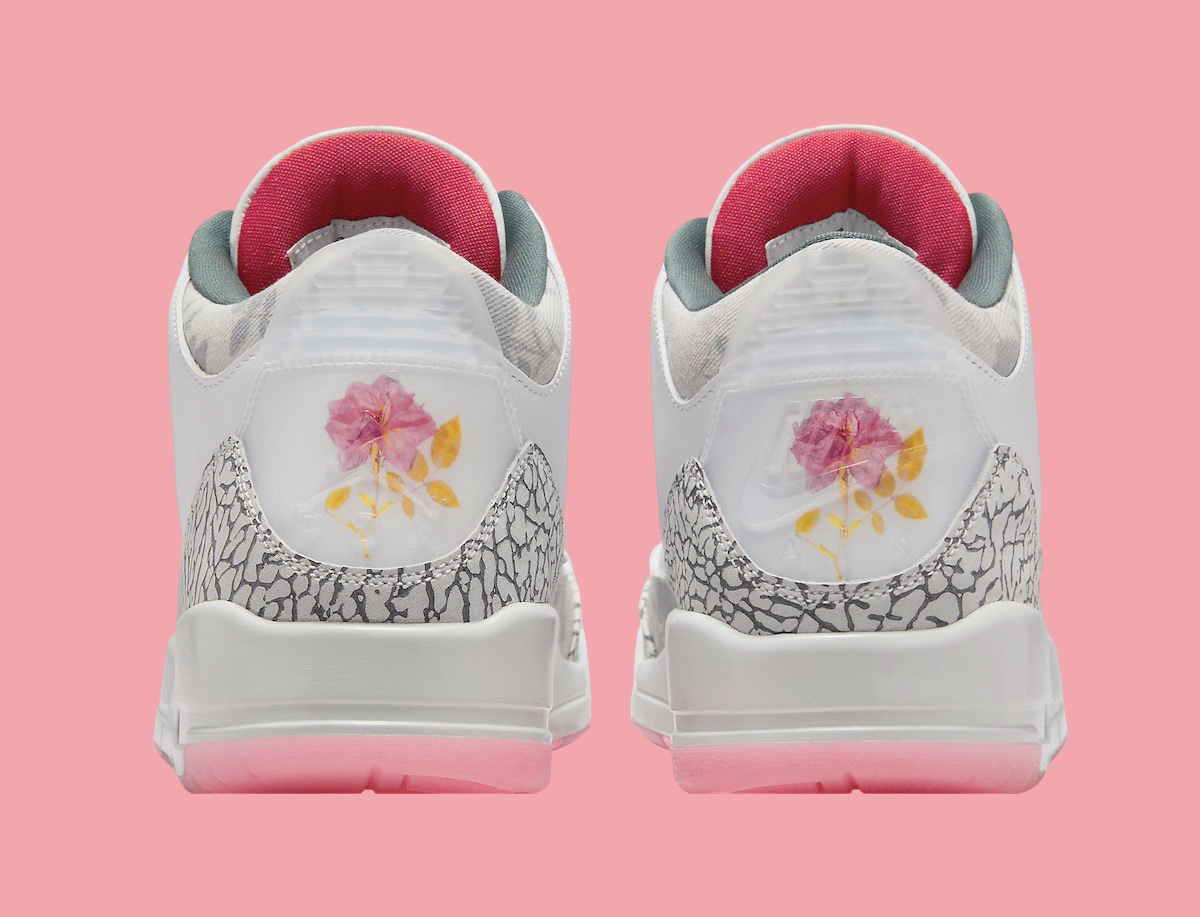 鞋身采用白色皮革、灰色爆裂纹与花卉图案的浅色帆布共同构建,细节则辅以红色妆点,最后粉色果冻外底收尾。
