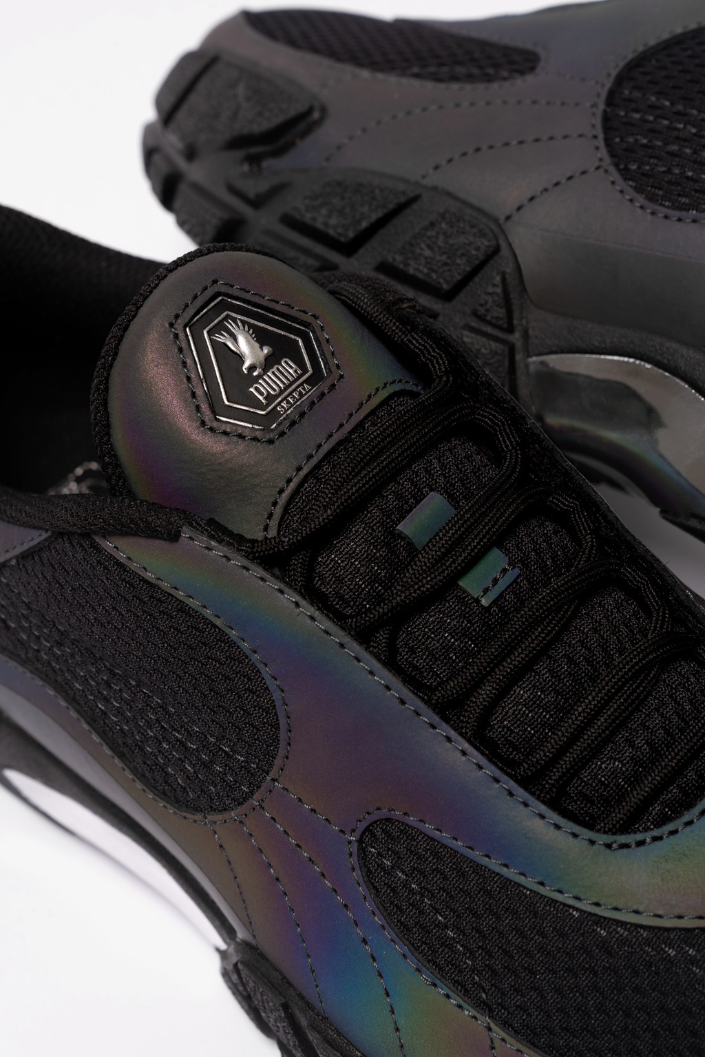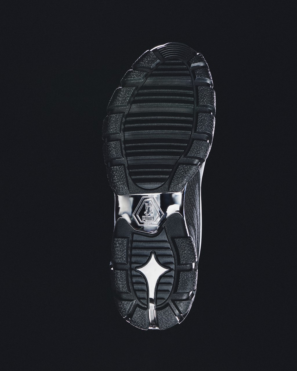中足位置抗扭模块以电镀银色示人,与整体的暗色调形成鲜明对比,其上印有 PUMA x Skepta 专属联名徽标。