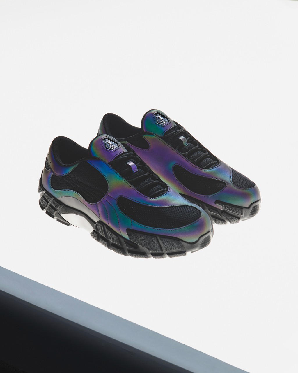 整体廓形从千禧年的流行趋势中汲取灵感,流体质感的鞋面线条刻画和全息幻彩色泽共同烘托出独特的科幻感。