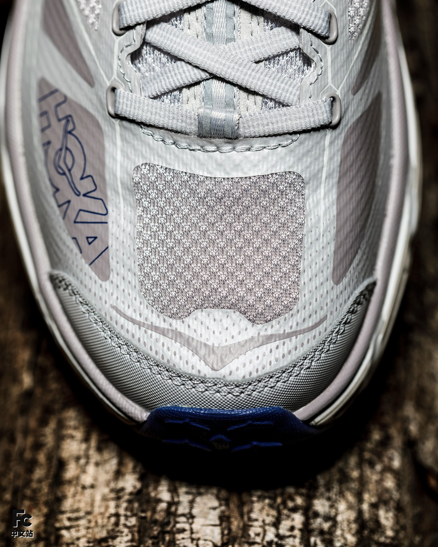 深蓝色 HOKA 品牌 Logo 及鞋型名称,彰显身份。