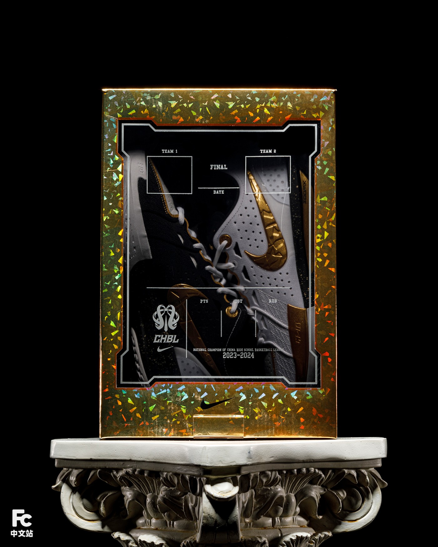 金色鞋盒映衬炫彩光泽,正面凸显一路过关斩将,踏入全国总决赛的荣耀历程。