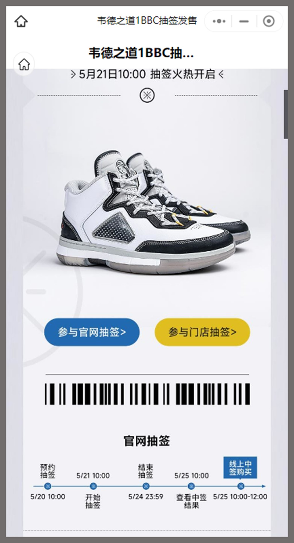 上李宁官方旗舰店小程序可参与官网线上抽签,5 月 25 日也就是明天上午 10:00 公布结果。