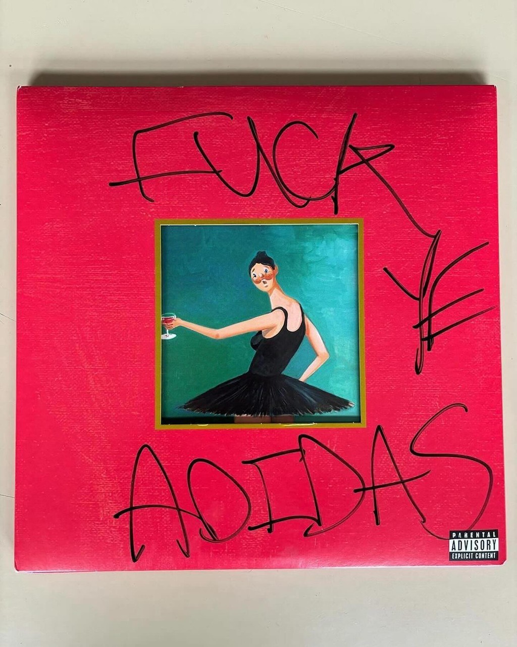 一位粉丝拿着一张唱片寻求侃爷的签名,侃爷二话不说直接大笔一挥,潇洒写下:“Fxxk adidas”,被周围诸多镜头捕捉了下来。