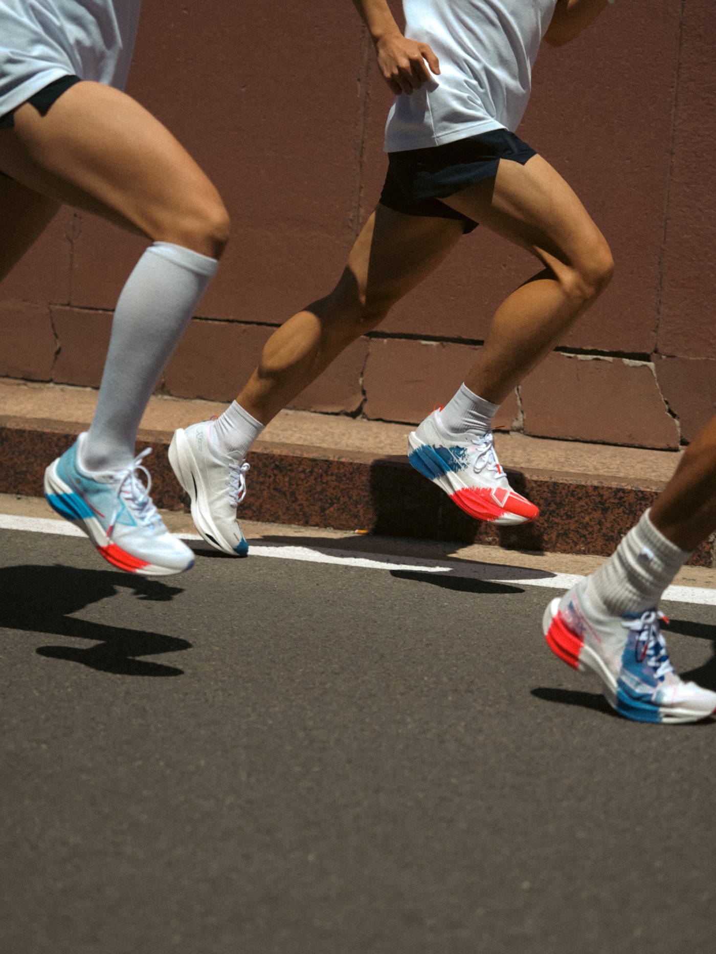 配色将醒目的红、白、蓝三色,通过简洁明快的构色语言,传递出凯旋不止是「胜利者」的配色,在小编看来,只要你穿上跑鞋,走出家门迈开步,就已经成功。