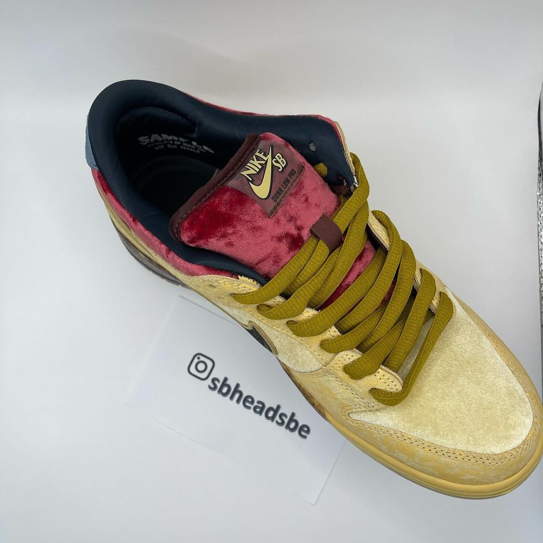目前曝光的这双暂为 Sample 版本,可以看出鞋身采用金黄纹理鞋面搭配红丝绒材质,营造剧院灯光与室内装潢的华丽气质。