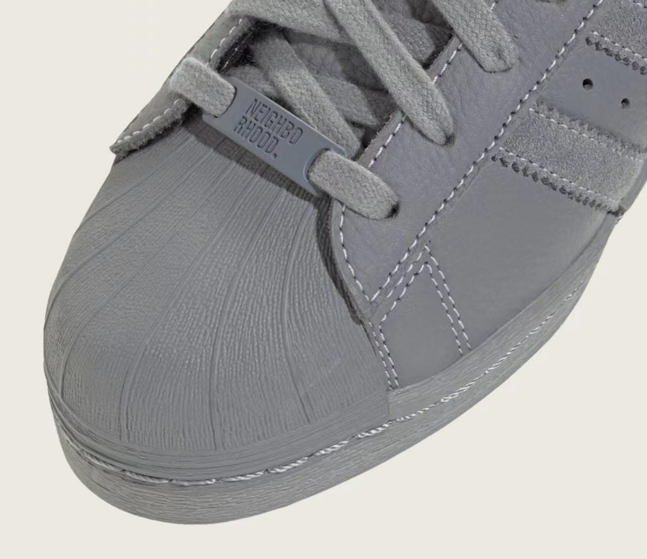 双方这次选择 Superstar 鞋型为基础,采用 NEIGHBORHOOD 标志性的灰色系呈现,使用大面积皮革材质打造,后跟选用麂皮搭配,颜值质感都在线。