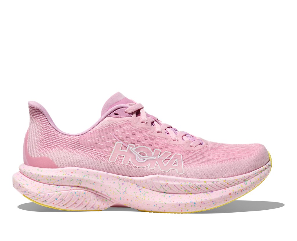 MACH 6 新色采用大胆鲜亮的暮光粉配色,搭配柠檬黄橡胶外底,增加鞋款视觉冲击力。