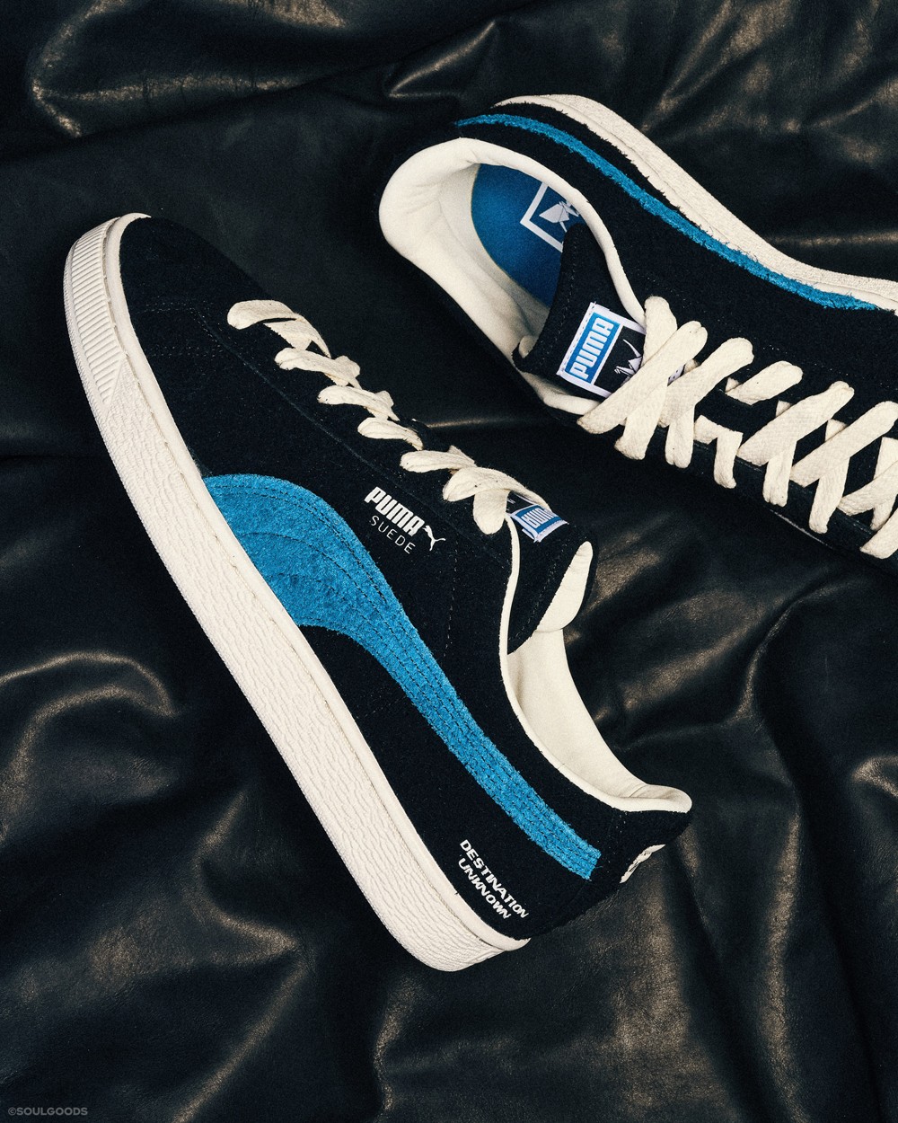 双方由致敬中国摇滚乐的辉煌历史为设计原点,选取 Puma 经典 Suede 为蓝本,鞋身通体采用质感细腻的麂皮打底,Liberaiders 标志性的蓝色和纸鹤图案、Destination Unknown 主题字样点缀细节。