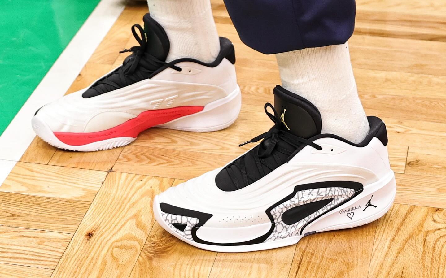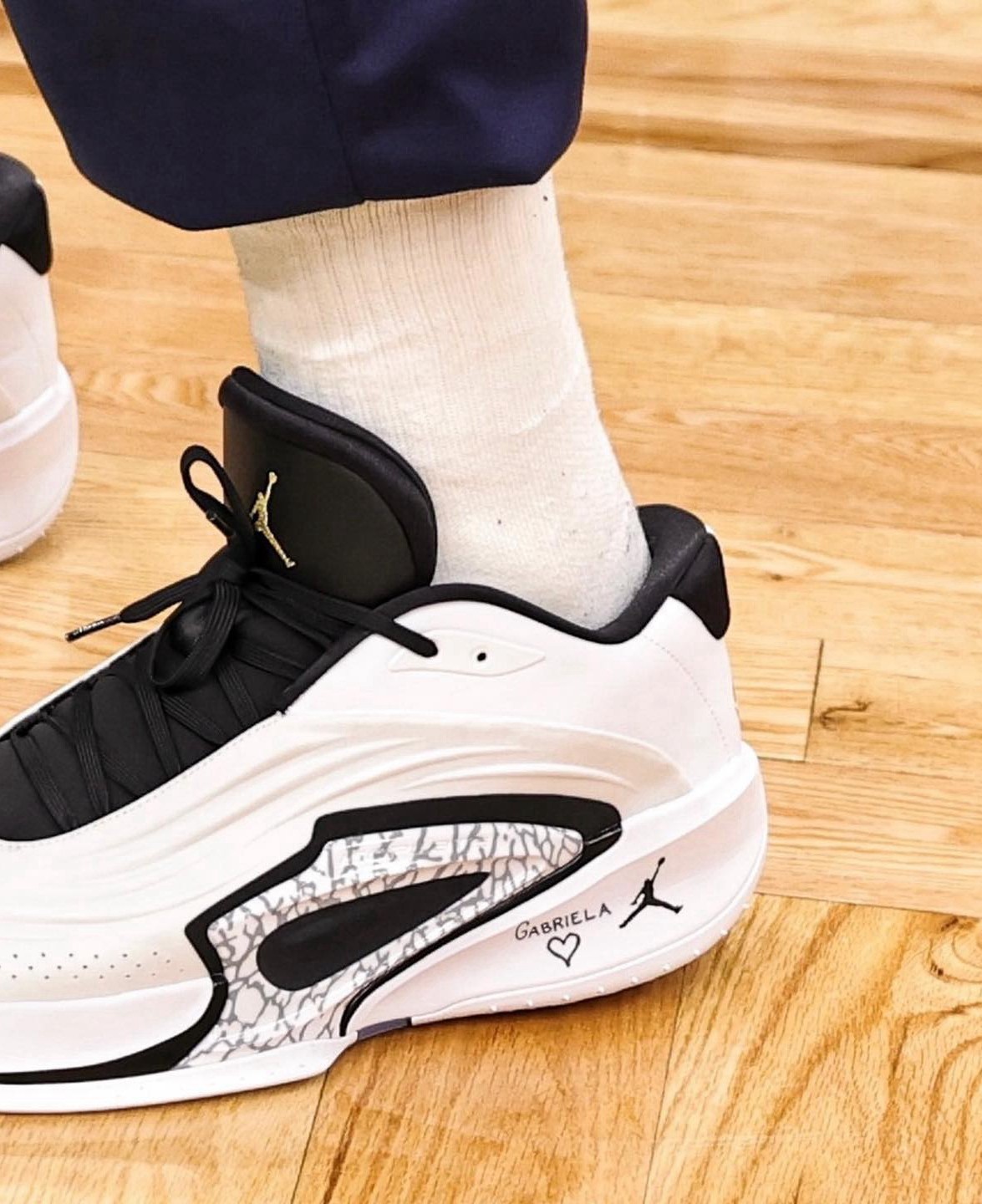 后跟侧面 Jumpman Logo 旁还专门印有东契奇女儿 Gabriela 的名字。