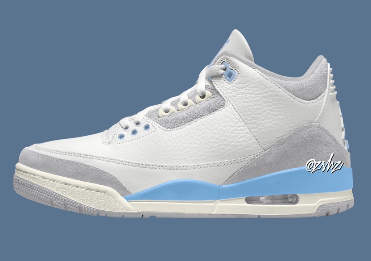 目前渲染图率先曝光,可以看出鞋身整体采用北卡标志性的白蓝装扮示人,AJ3 标志性的爆裂纹被替换成浅灰色的翻毛皮革呈现。