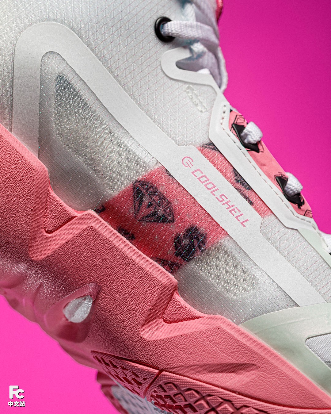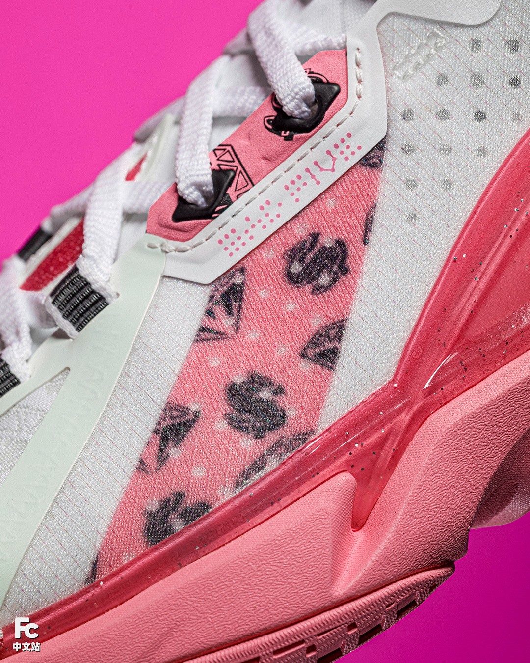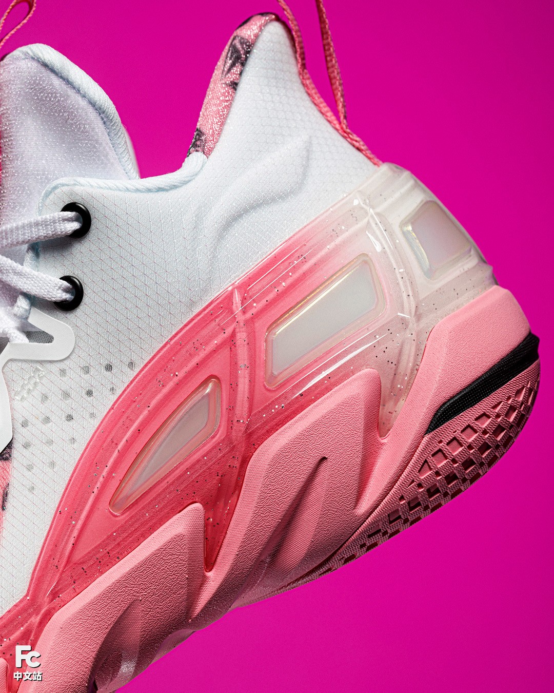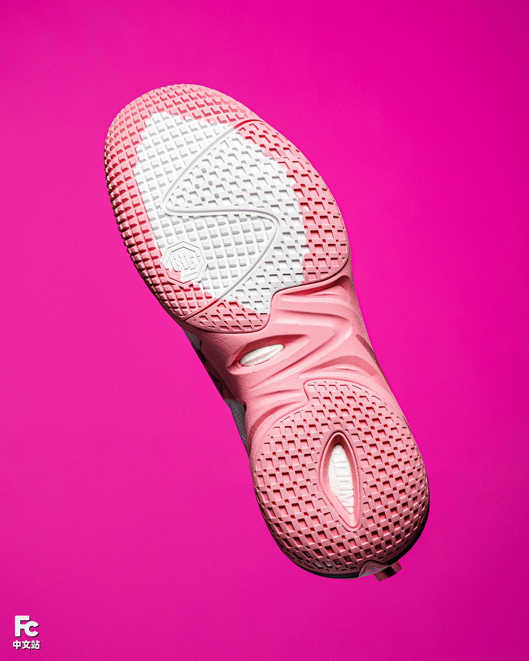 外底 TUFF OS 耐磨橡胶也是双色拼接,嫩粉色搭配白色呼应鞋面造型,开孔内可以窥见全掌䨻轻弹科技。