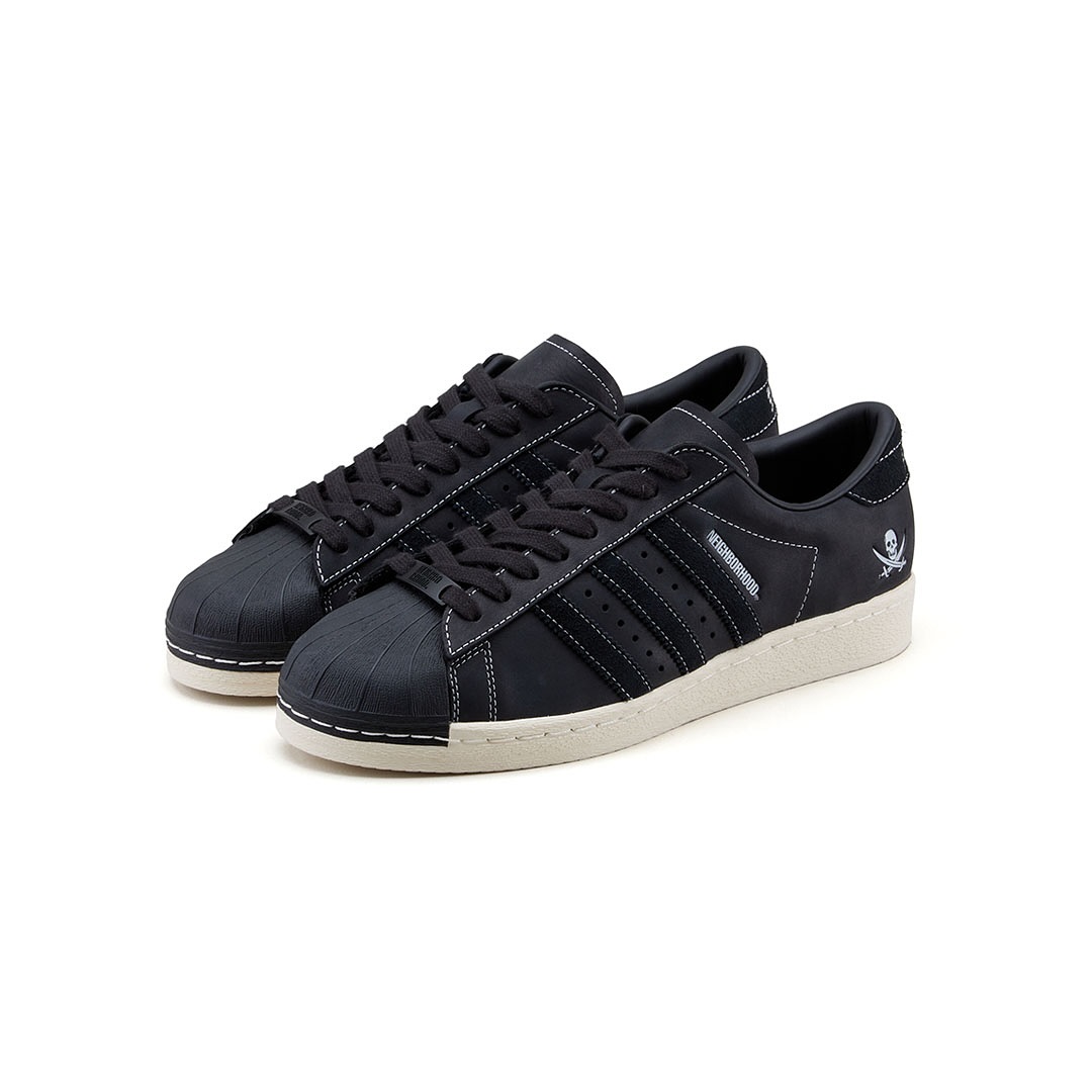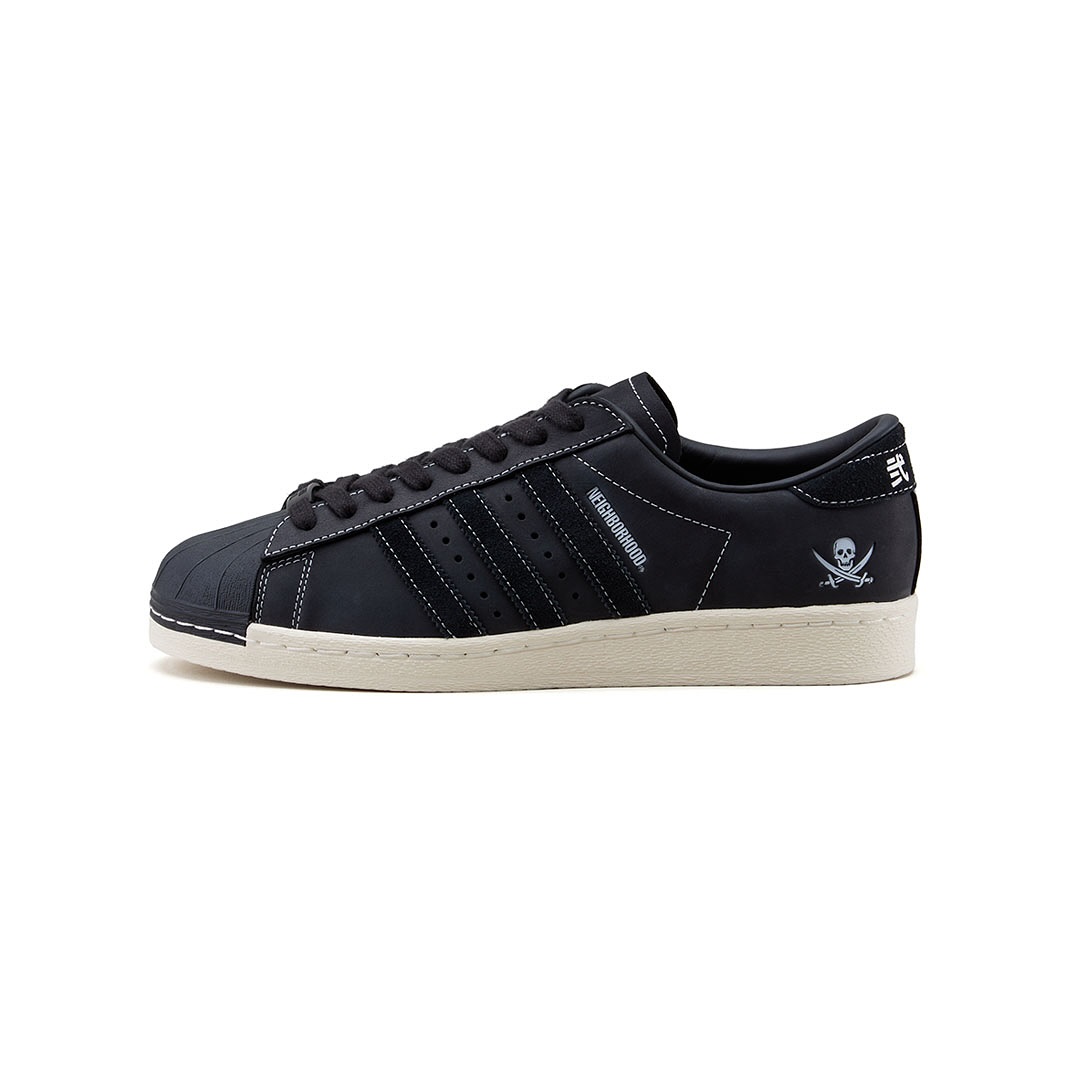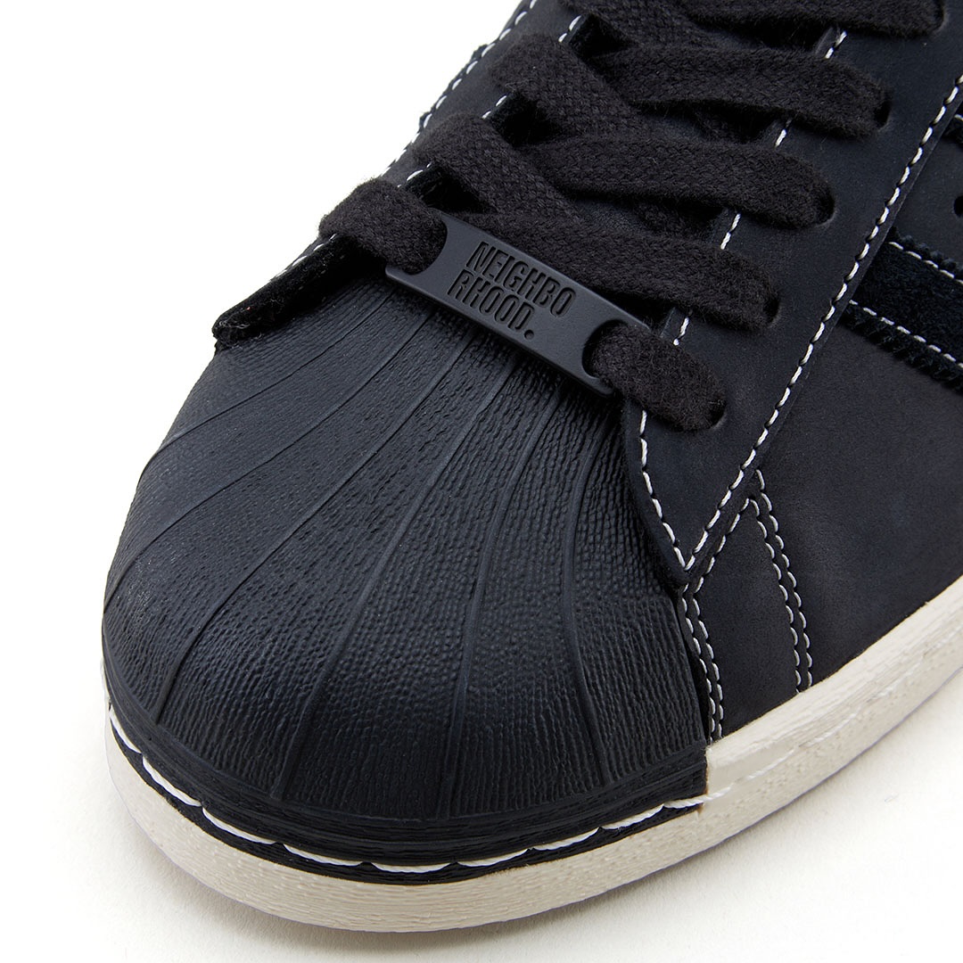 Superstar NEIGHBORHOOD 2005 采用优质的黑色皮革鞋面,搭配同色系绒面革三道杠和做旧中底打造。