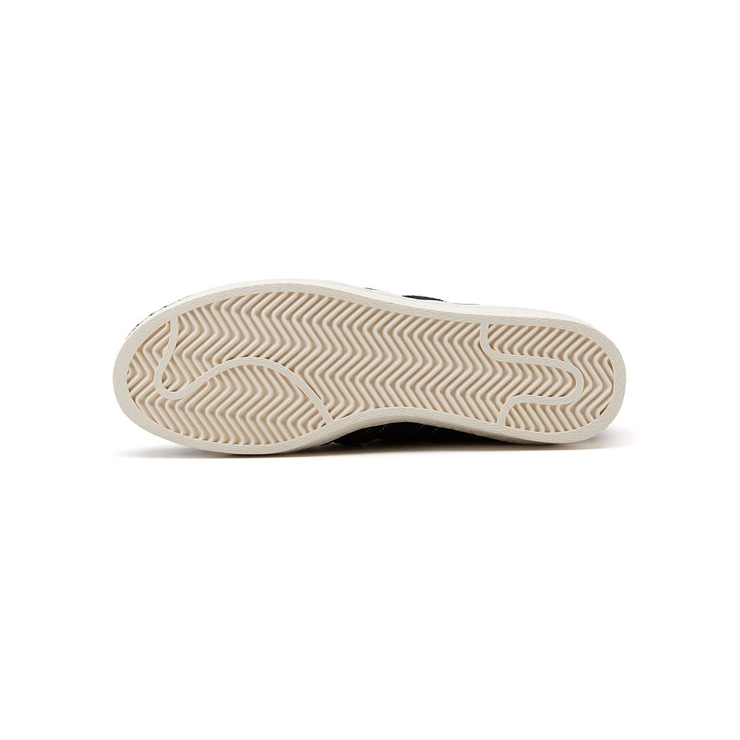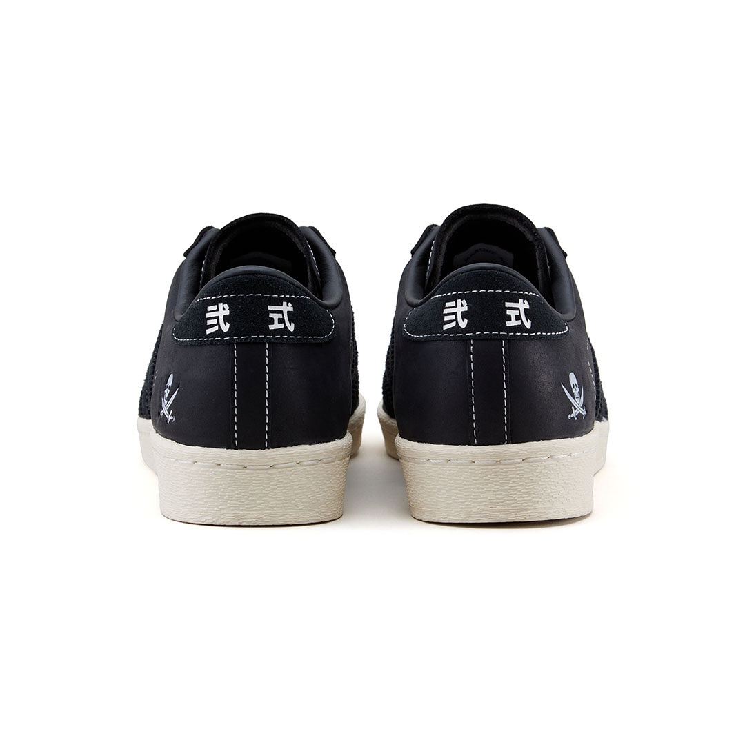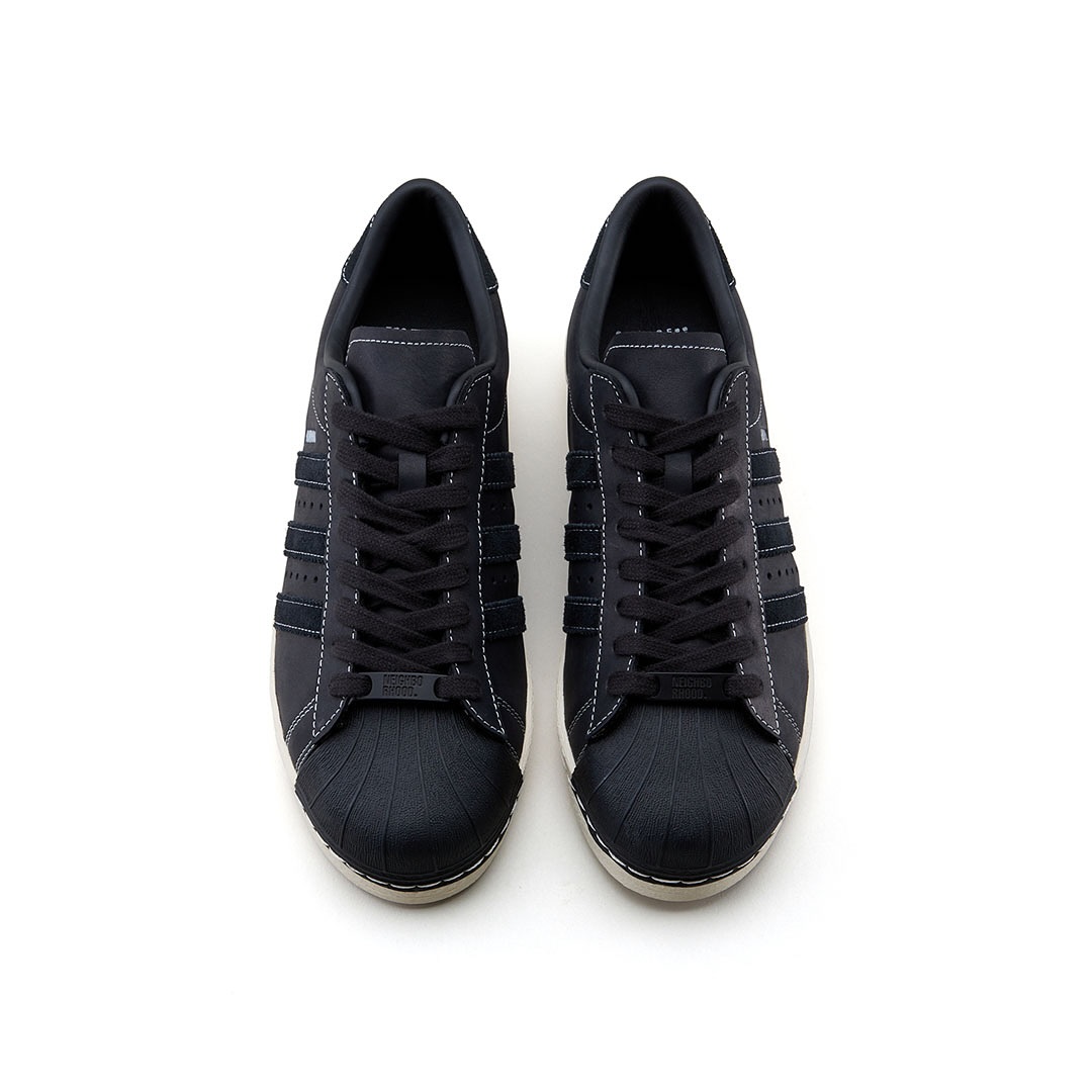 Superstar NEIGHBORHOOD 2005 采用优质的黑色皮革鞋面,搭配同色系绒面革三道杠和做旧中底打造。