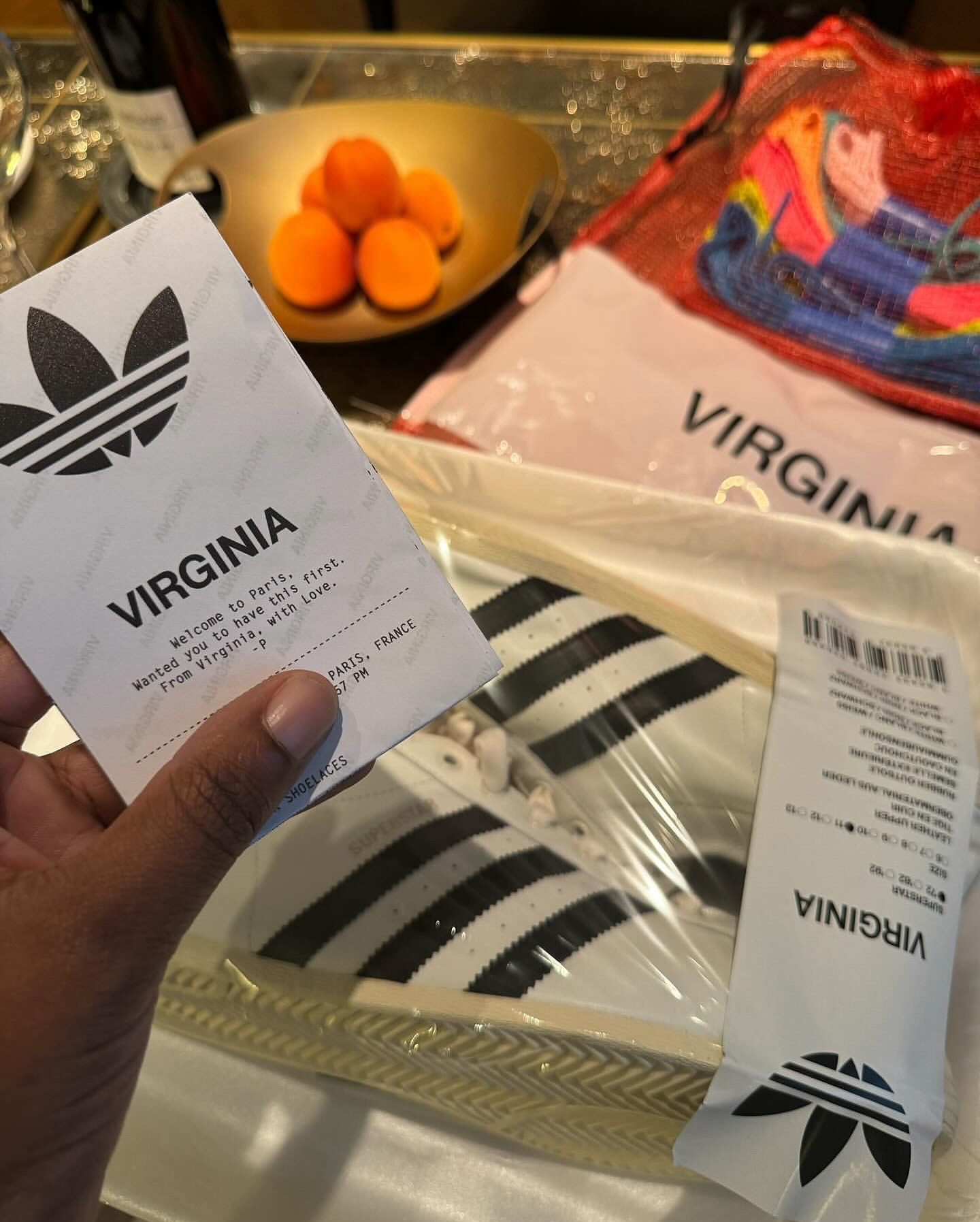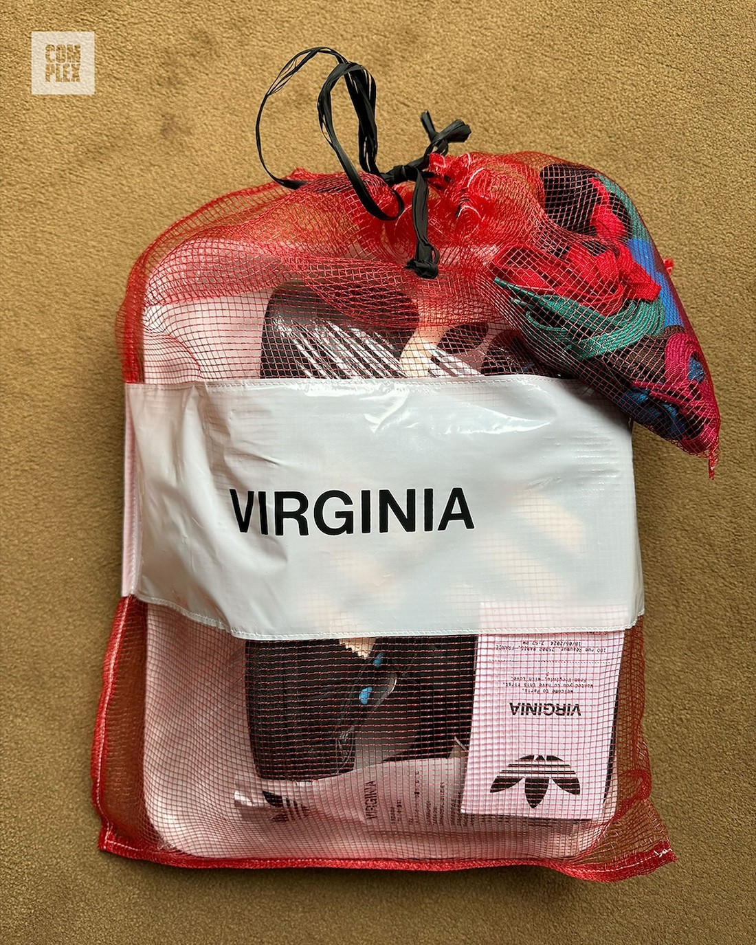 鞋款采用印有 Virginia 品牌的特殊包装,以纪念菲董的家乡,而保鲜膜的打包方式也是相当大胆了。