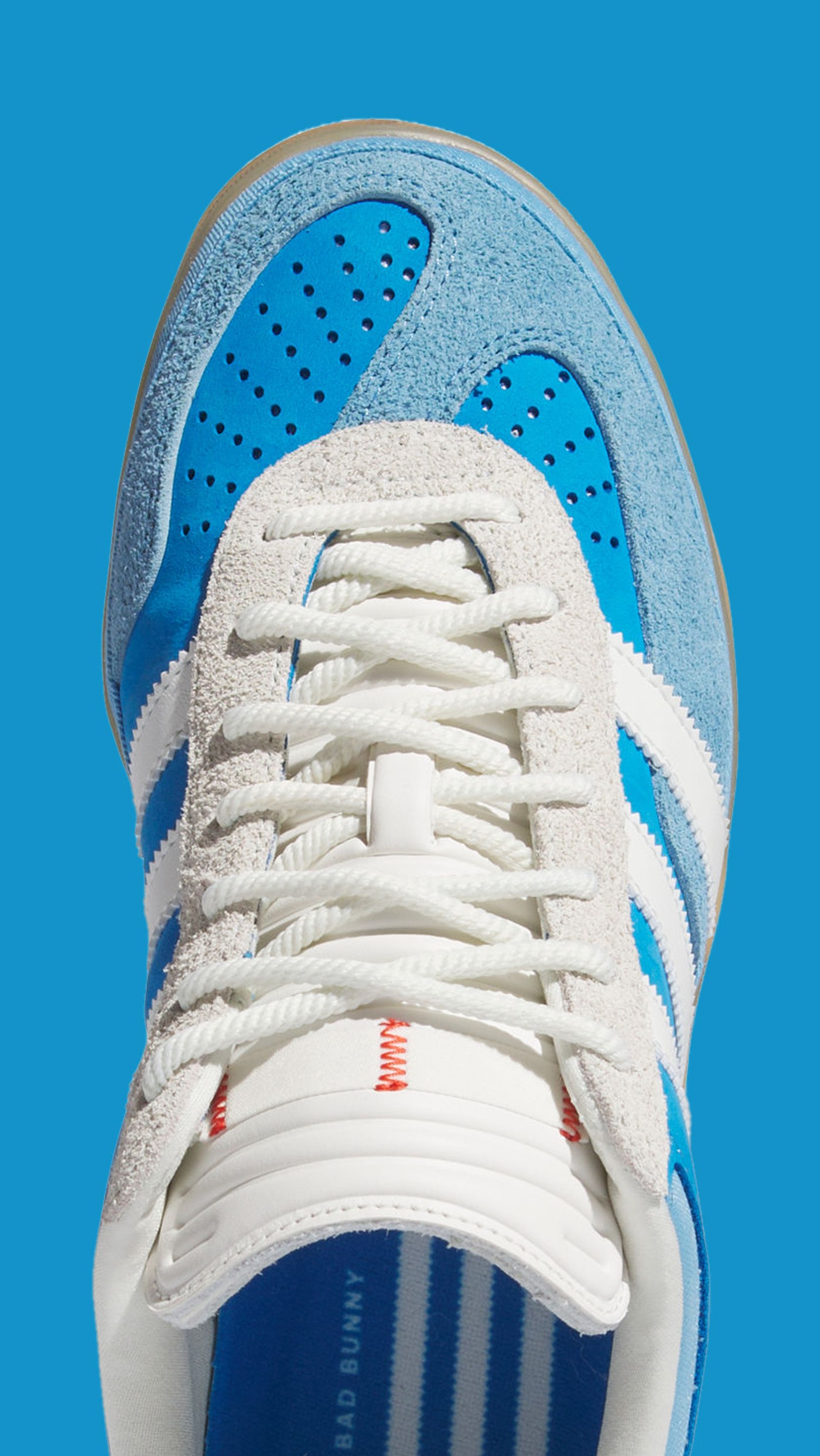整体采用了代表着海洋的蓝色调呈现,加宽加厚的鞋身轮廓、外露式的标签、以及一反常规的造型线条,都体现着 Bad Bunny 的 “叛逆” 风格。