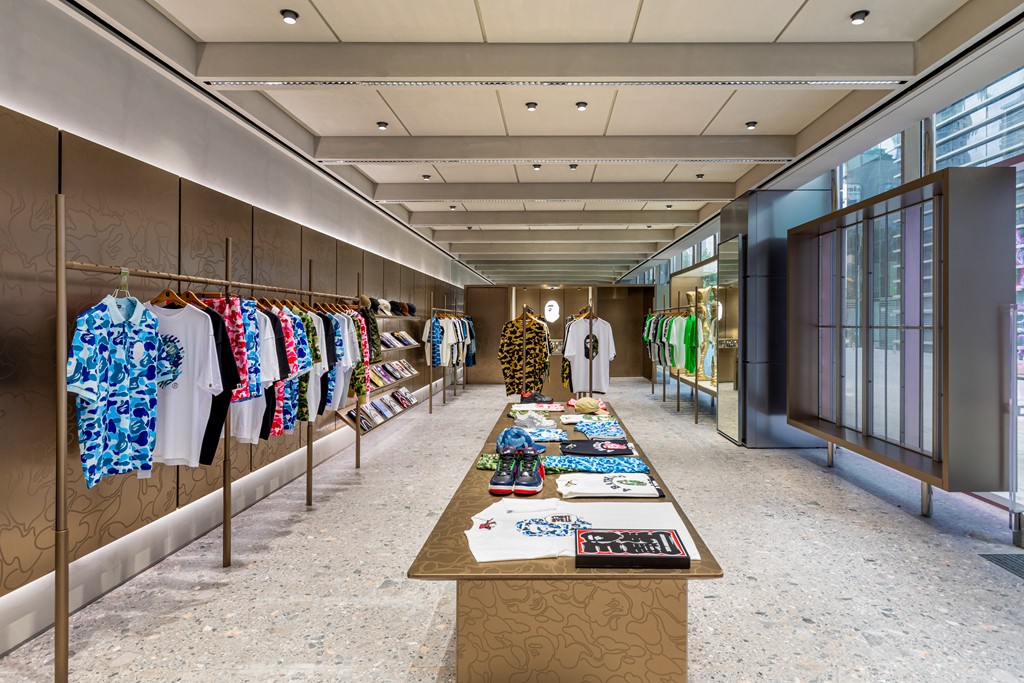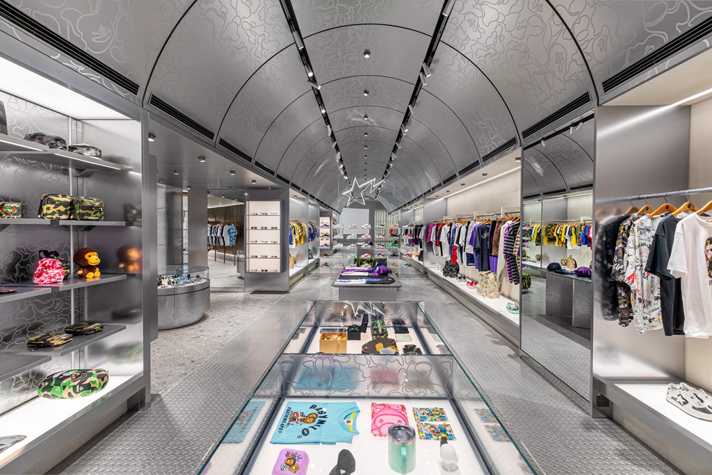 沿袭 BAPE® 全球专门店一脉相承的未来科幻美学,崭新空间以香槟金、太空银双色调营造奢华时尚氛围。