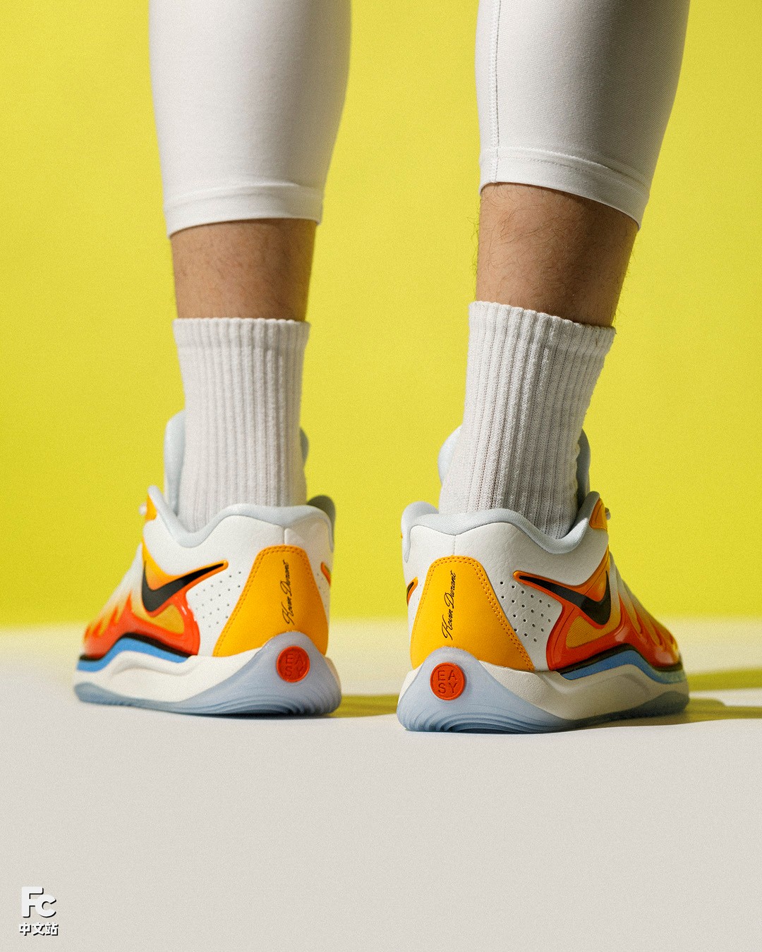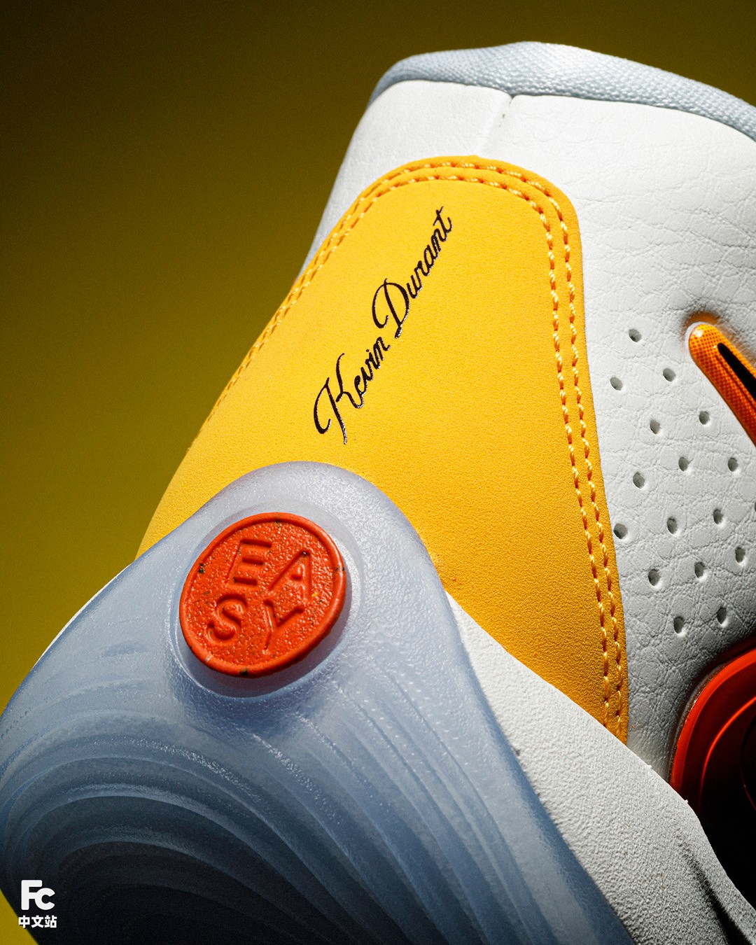 当然了,毕竟还是 KD 的签名鞋,鞋身各处他本人的元素肯定少不了,比如后跟的花体名字,非常直观地展示鞋款身份,下方的 EASY 对应他的绰号 “Easy money sniper”。