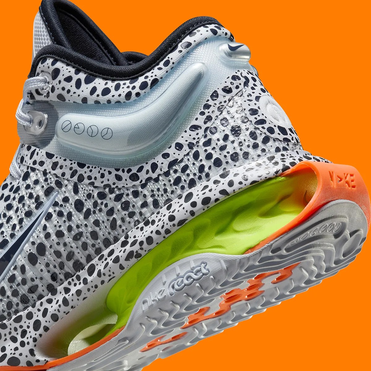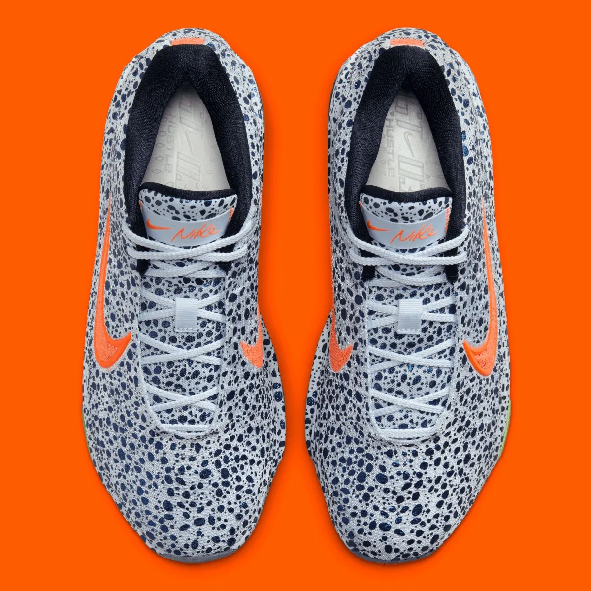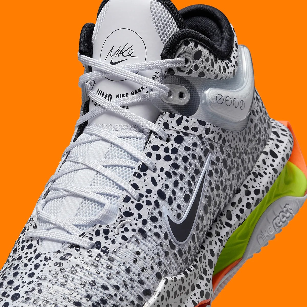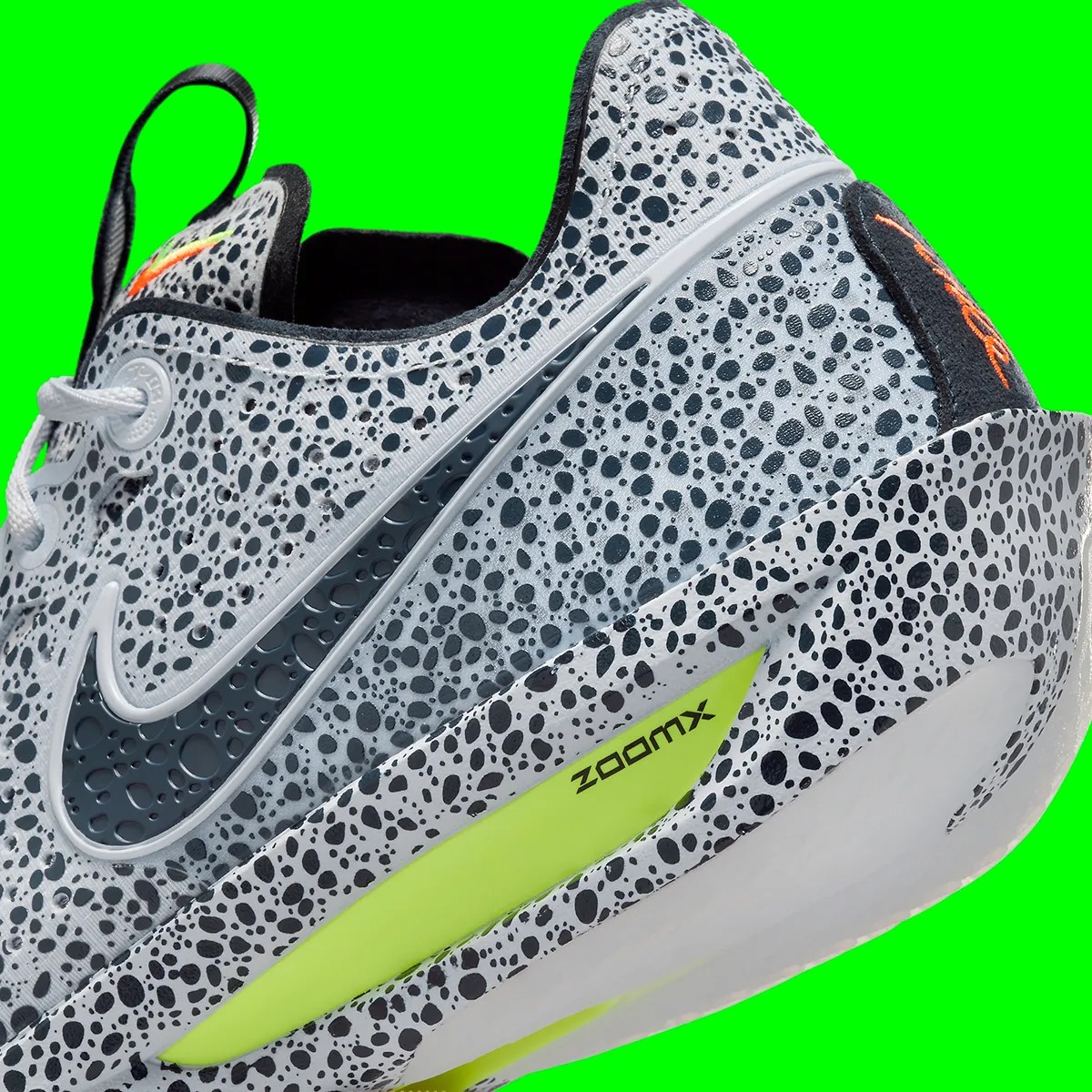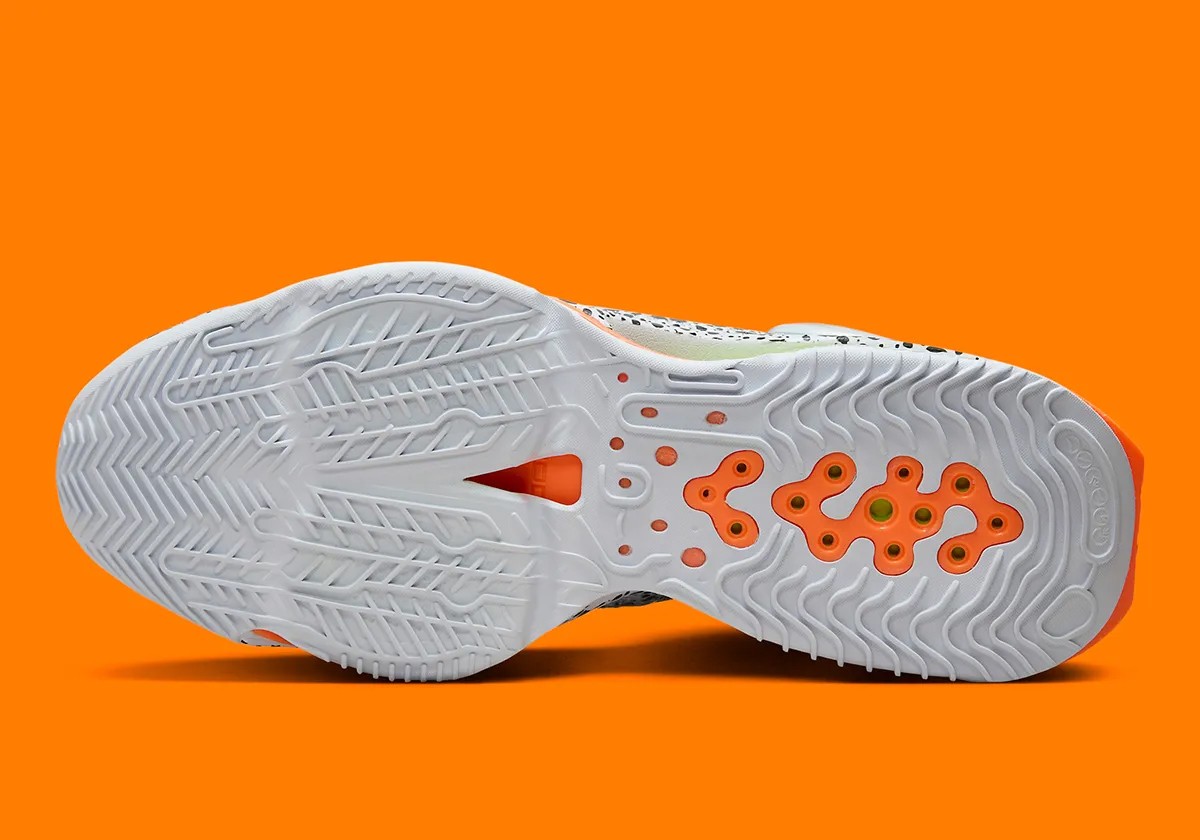细节方面,Swoosh 与气垫、缓震等位置,则辅以醒目的荧光橙与荧光绿点缀,释放出鲜明的视觉冲击。