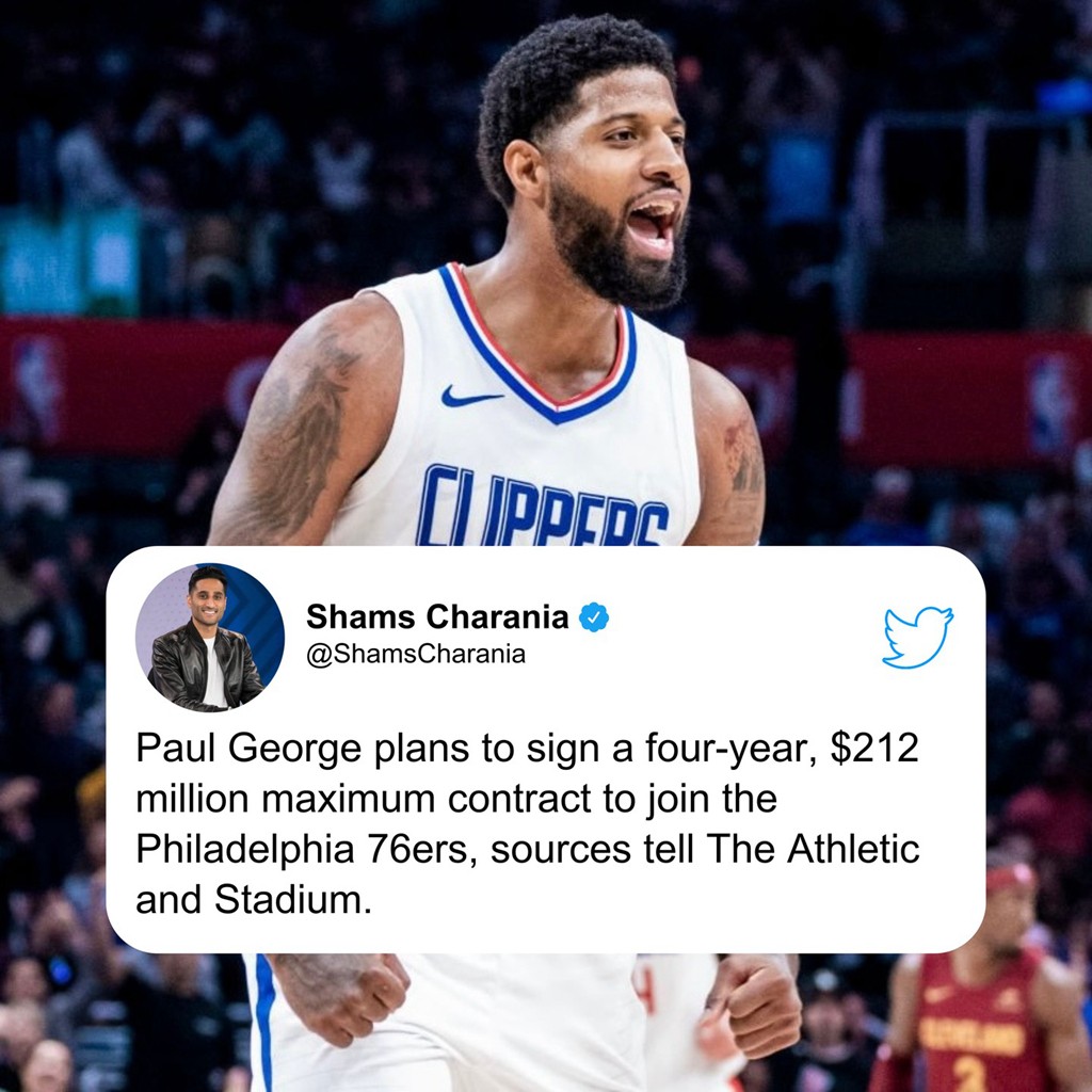 除了汤普森外,今年自由市场另一条 “大鱼” 也在昨天确定了结果,那就是保罗·乔治离开快船加盟 76 人,携手恩比德、马克西一起冲冠。