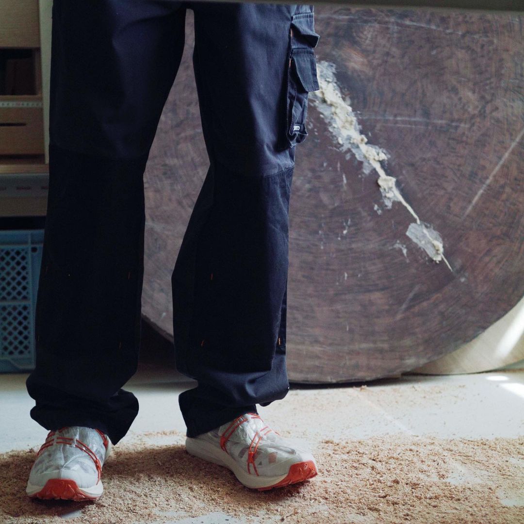 隈研吾的工作大部分都在办公室之外进行,包括从工地会面到出差。因此,该鞋款的结构设计从其日常需求出发,让他无需换鞋即可自由游走于建筑工地和酒店之间。