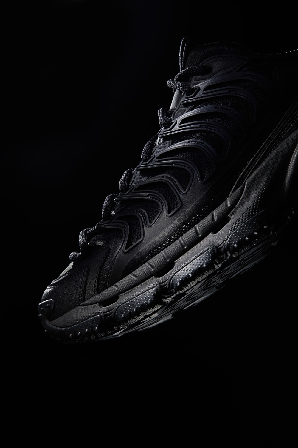 机械龙骨般的鞋面,则是采用全黑科技感网布、立体 TPU 和沥青纹理革料等材质,融入软钉元素,结合热压装饰线条与镂空框架设计制成。