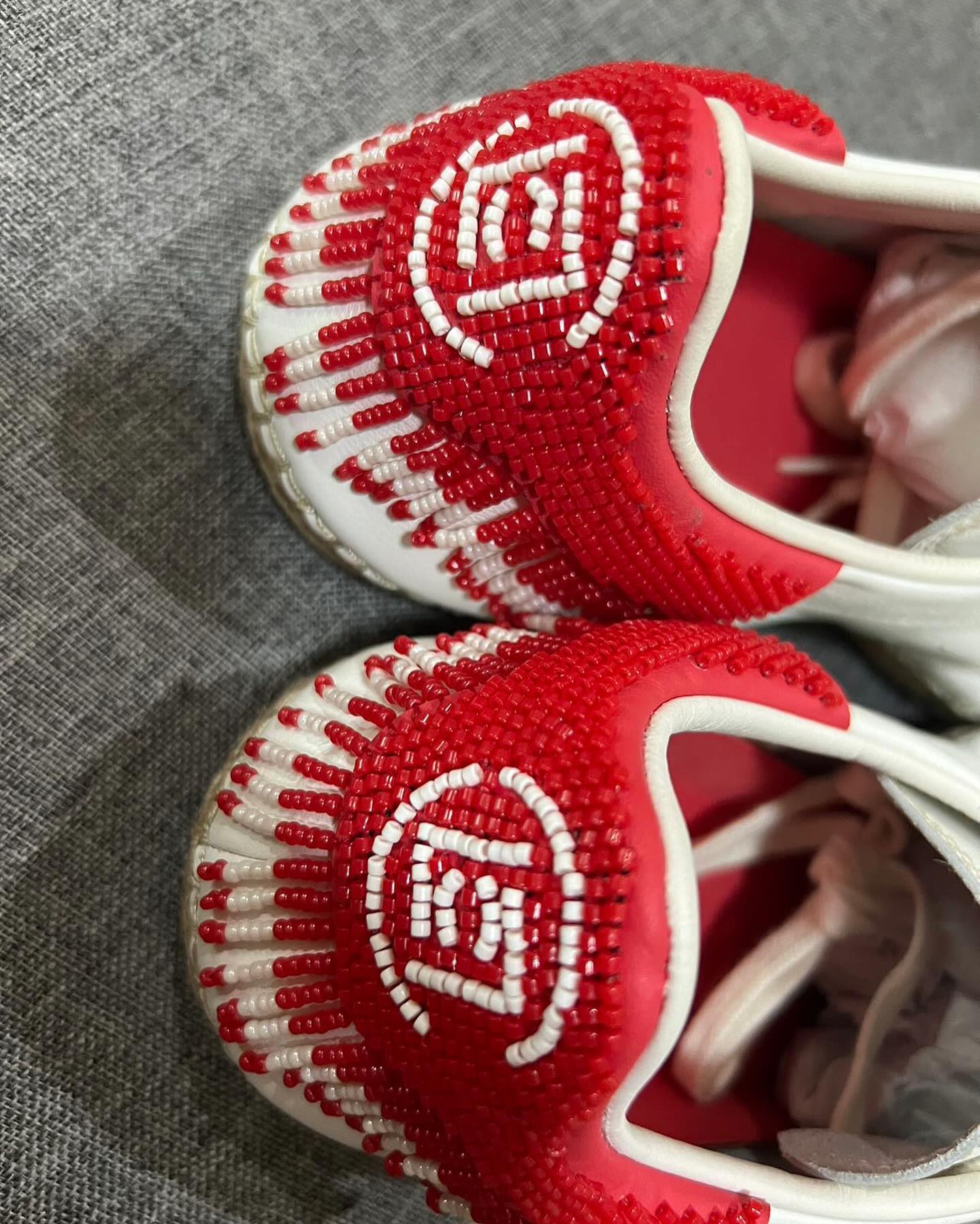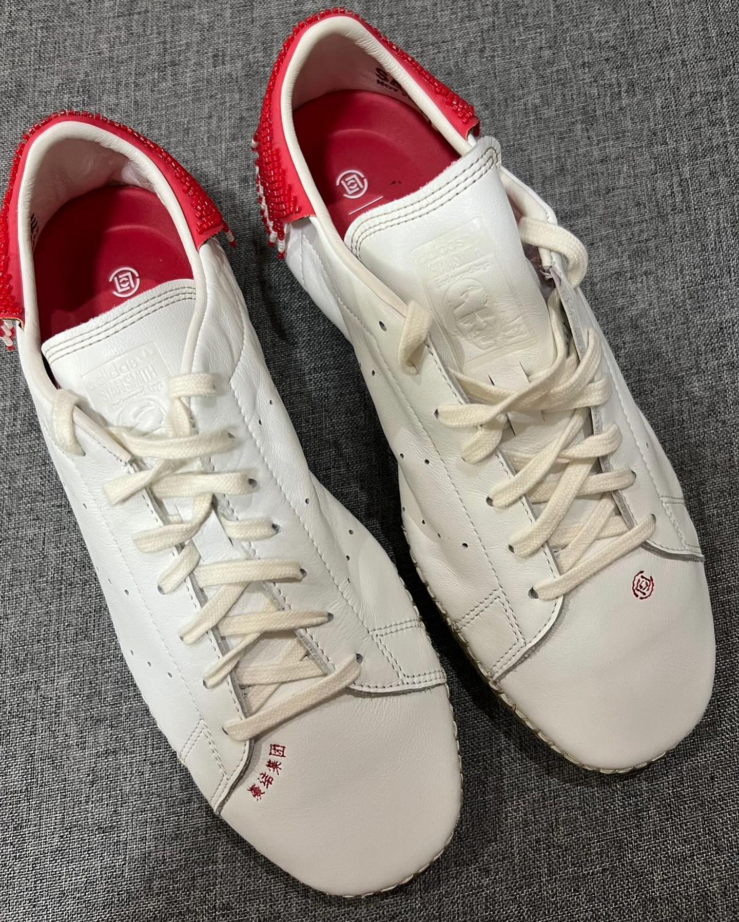 整体采用熟悉的小白鞋轮廓示人,最大亮点在于 Stan Smith 的后跟“红尾”部分,辅以红白串珠的形式勾勒出 CLOT 醒目标志,并在下方模拟出珠帘的视觉效果,新颖又亲切。