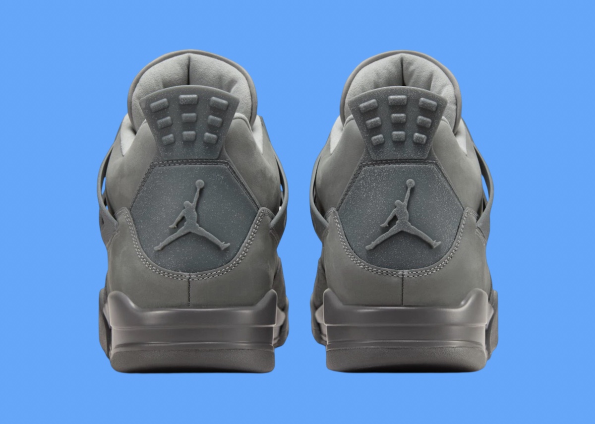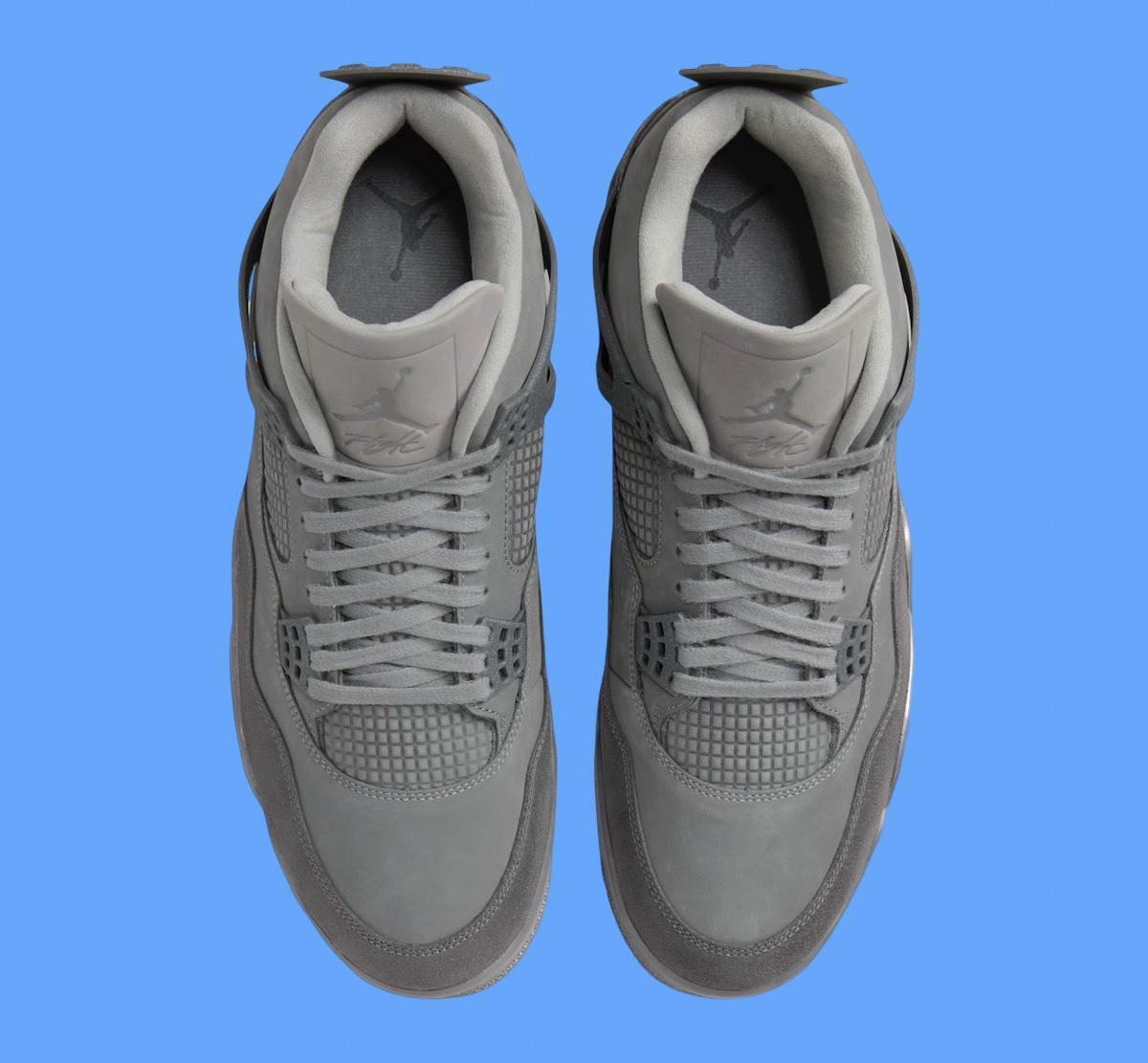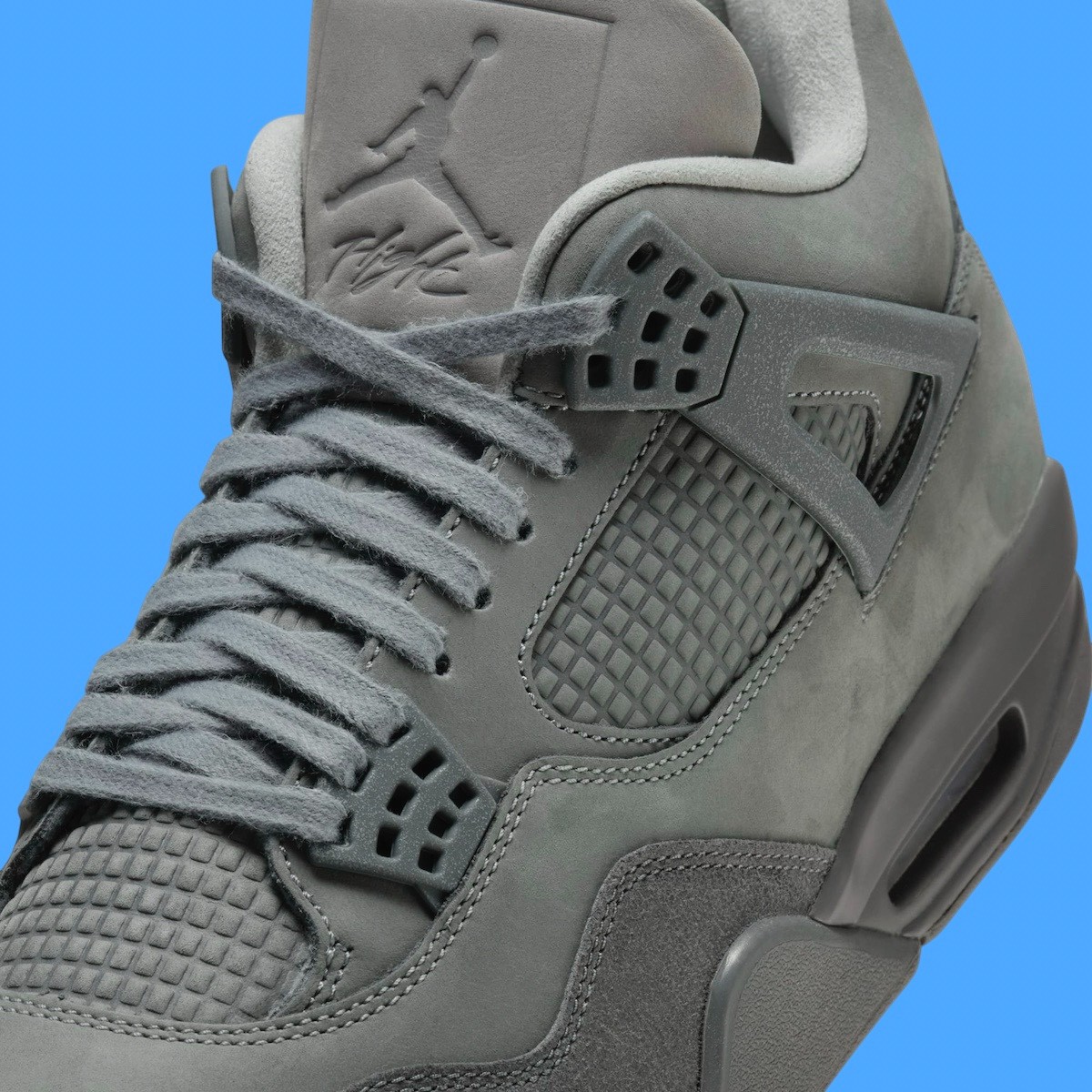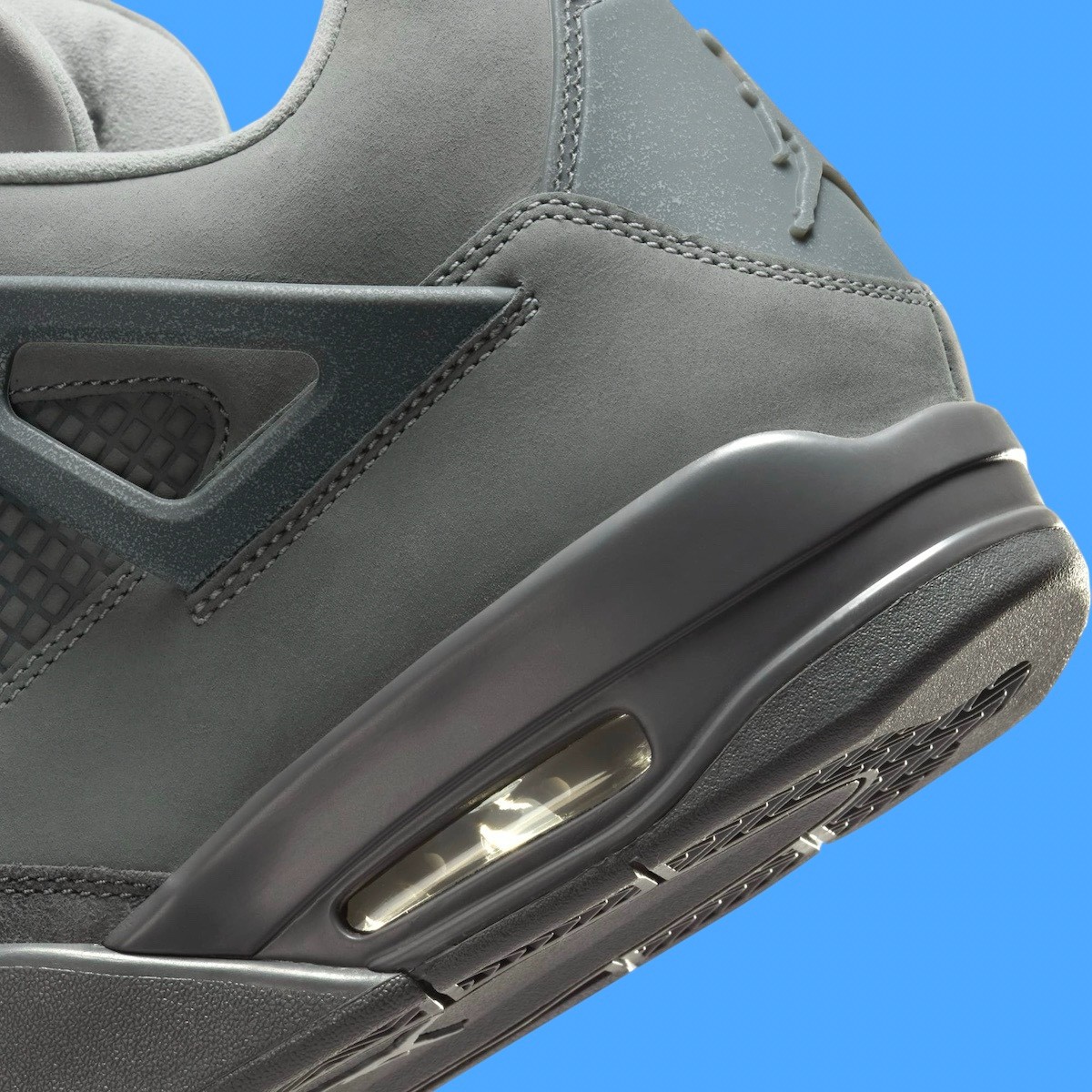 主体鞋面覆盖刷色明显的麂皮材质,辅以 AJ4 SE 版本上常见的皮质网格,保持整体冷淡、素雅的调性同时释放不俗质感。