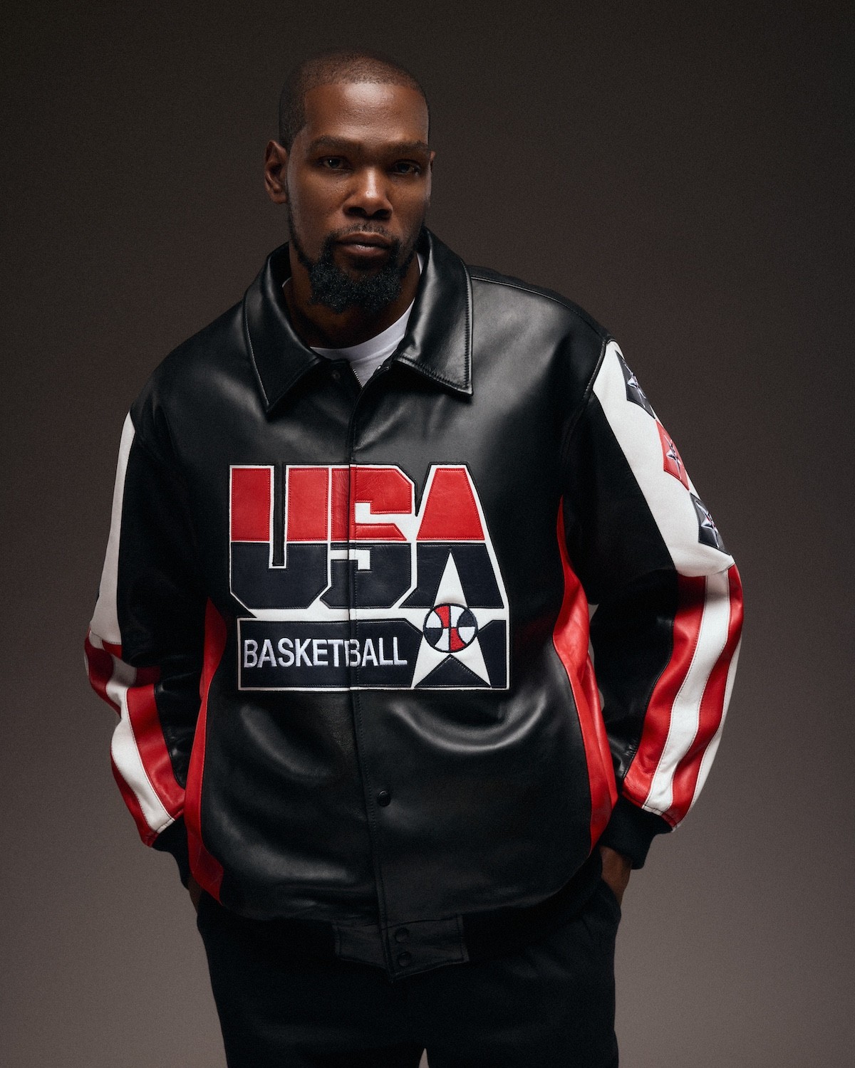 最重磅的单品当属 KITH for USA 夹克,这款拼色夹克采用优质意大利 Nappa 皮革制成,采用复古风格的拼接设计。