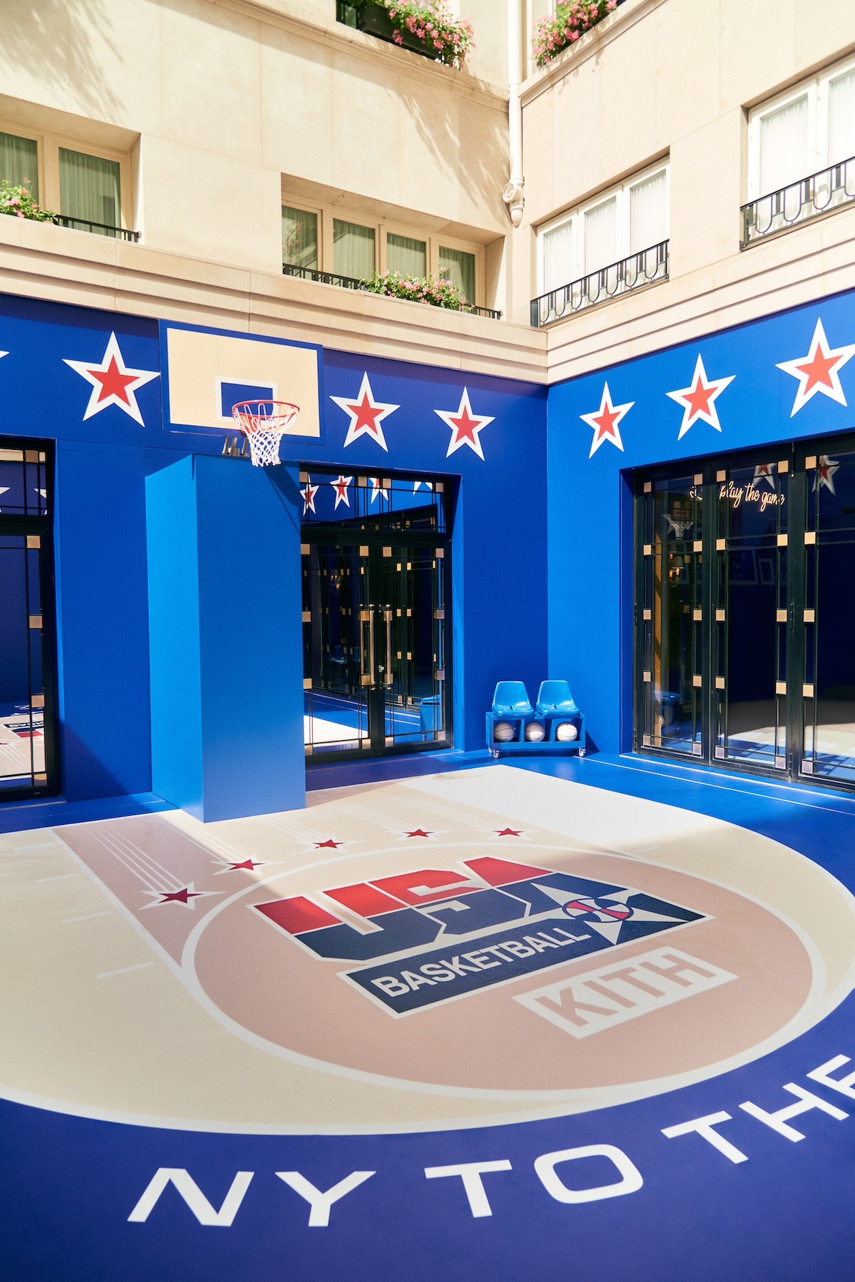 为了庆祝这个系列,KITH 与四季酒店合作,将巴黎历史悠久的乔治五世酒店的庭院改造成一个定制的篮球场。