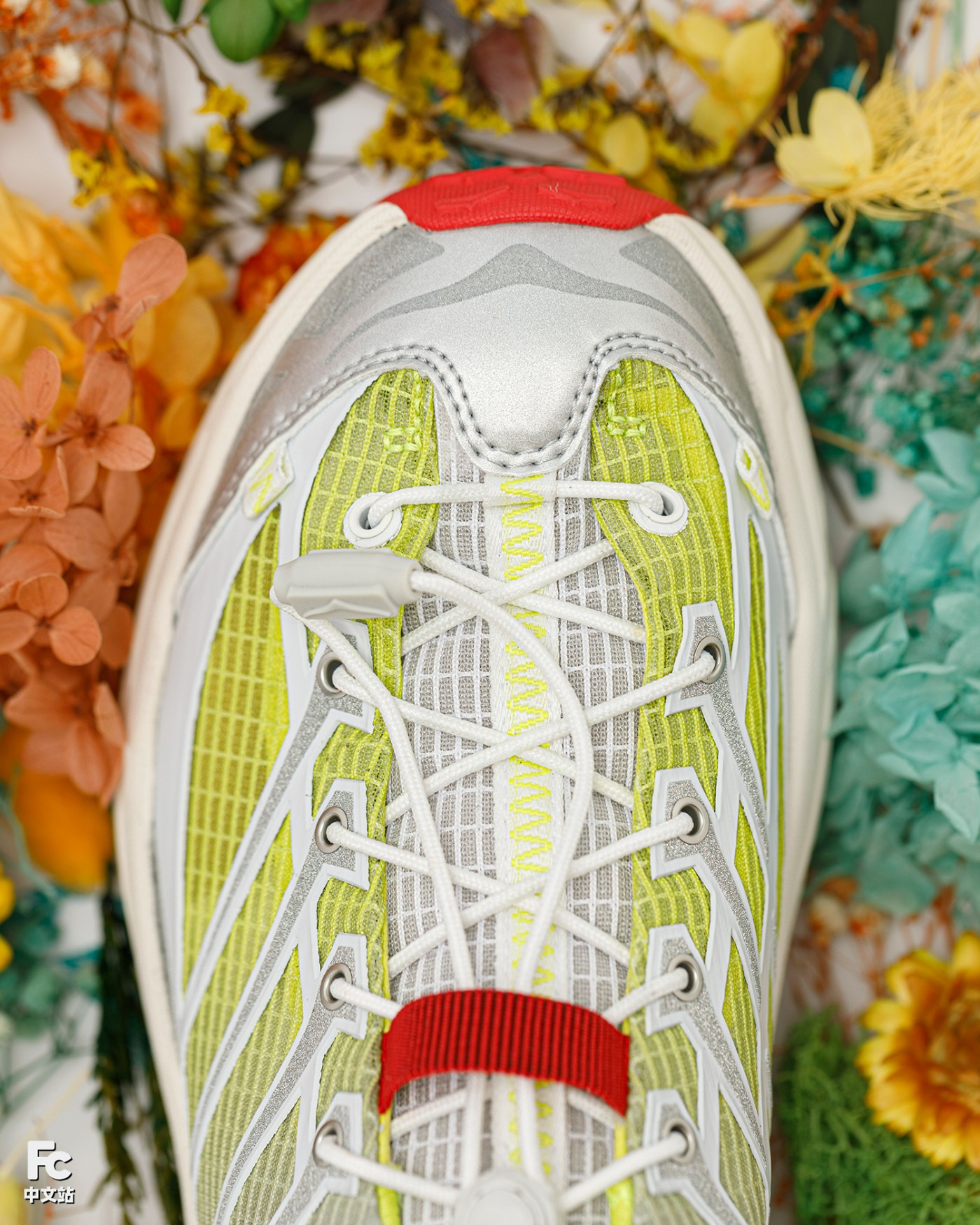 鞋罩部分由大面积荧光黄覆盖,红色线条在其中勾勒点缀,具有强烈的视觉冲击感。