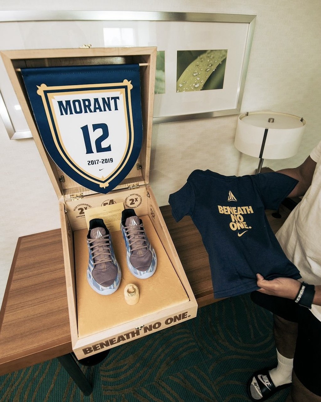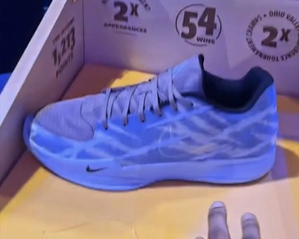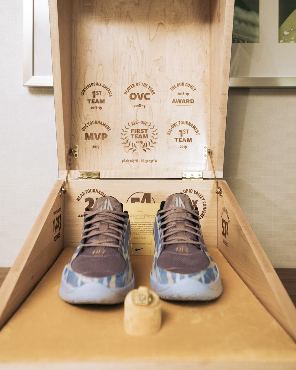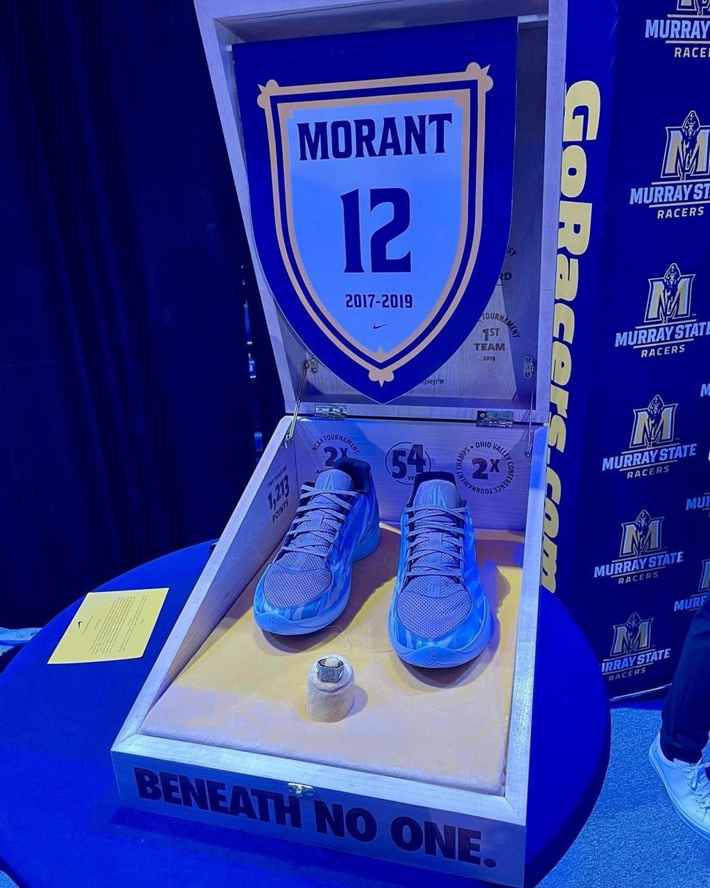 可以看到,配备了精美制作的木质鞋盒,上面印满了莫兰特大学时期的荣誉,还摆放着一枚名人堂戒指。