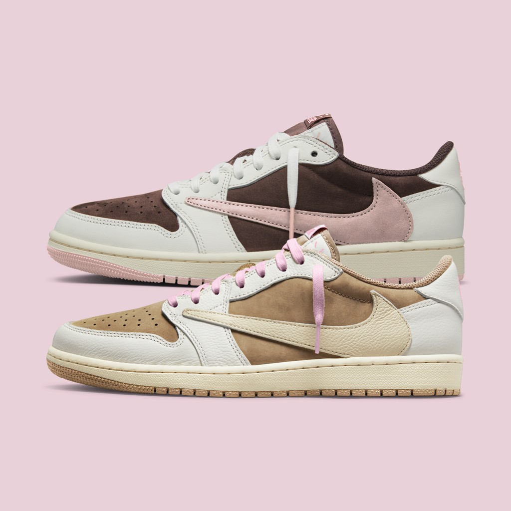 联名方面,Travis Scott x Air Jordan 1 Low 调色盘模式继续,有亿点点好看的两款 “粉倒钩” 赫然在列。