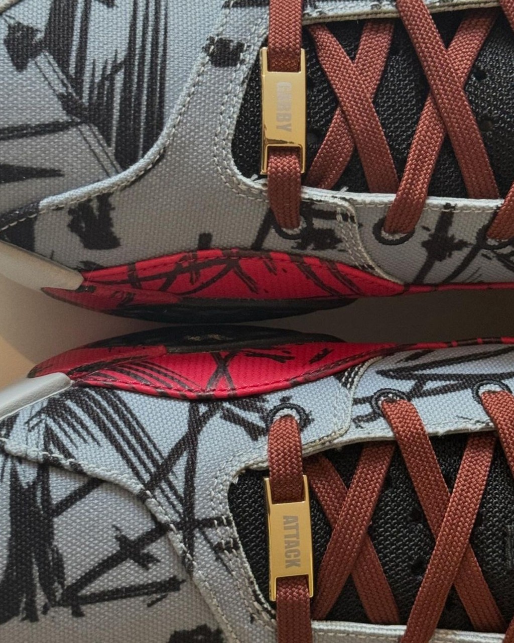 鞋头金色金属鞋带扣铭牌上,一边是 Gabby 的名字,一边是 Attack 字样,呼应《进击的巨人(Attack On Titan)》。
