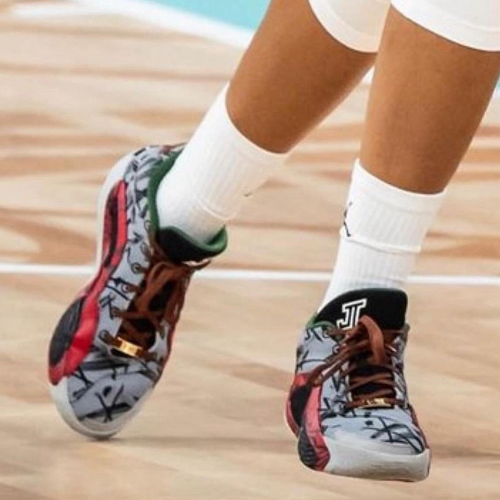 比如在最近的奥运篮球赛场上,法国女篮球员 Gabby Williams 就上脚了 一双十分特别的《进击的巨人》主题 Jordan Tatum 2。