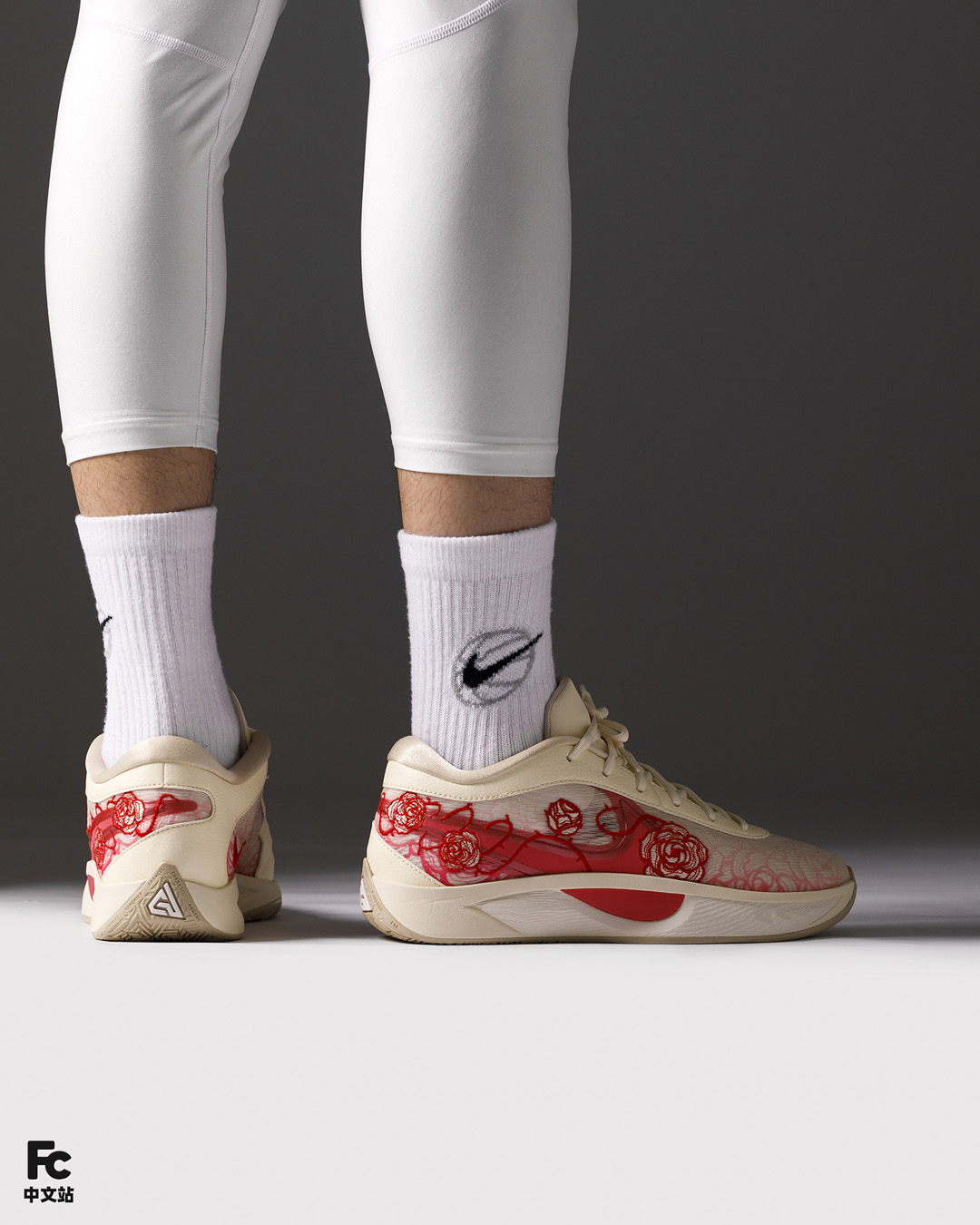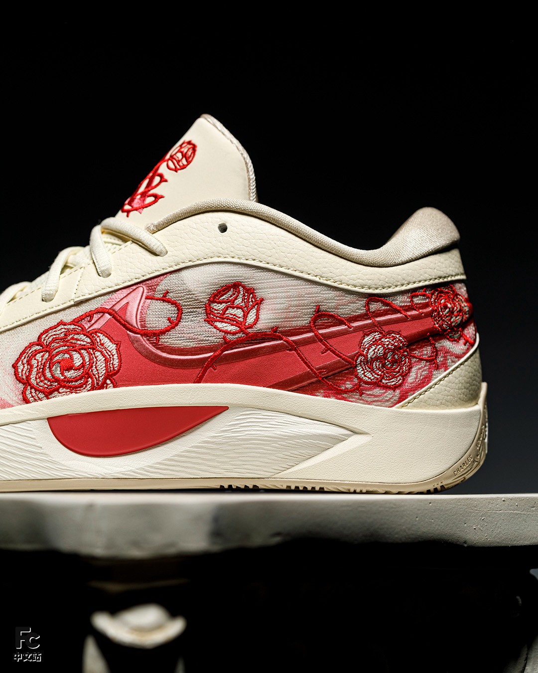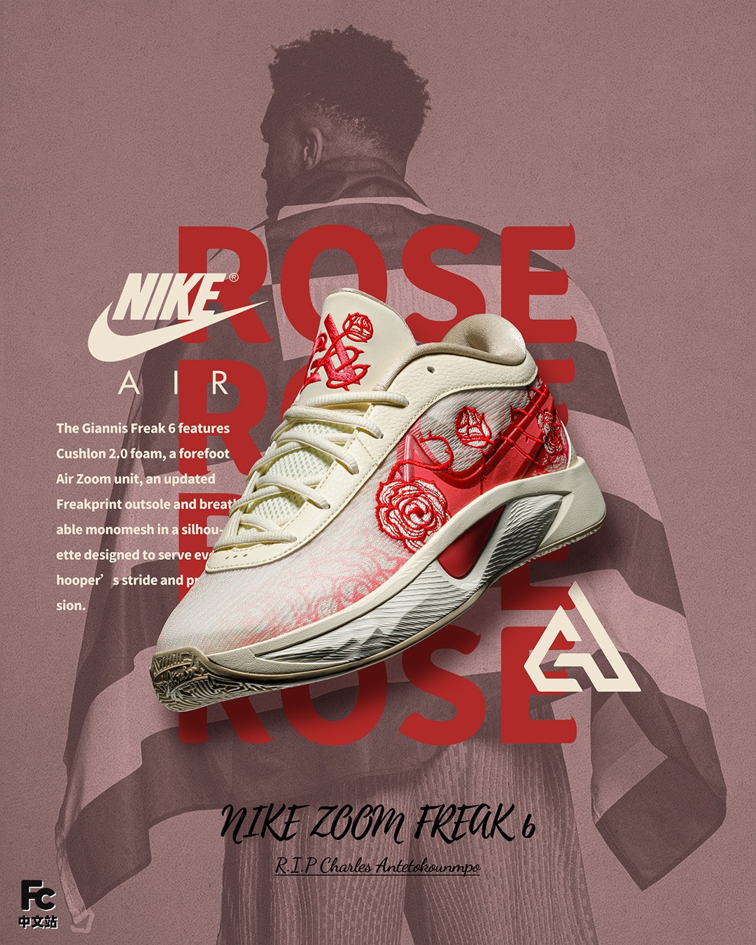 整双鞋以玫瑰为主要灵感,玫瑰花是字母哥父亲最爱的花卉,同时也象征着爱,环绕 Swoosh 的一圈圈荆棘,仿佛在诉说着阿德托昆博家族一路以来的艰苦与不易。
