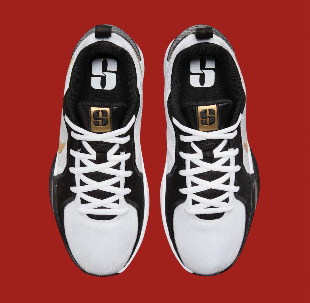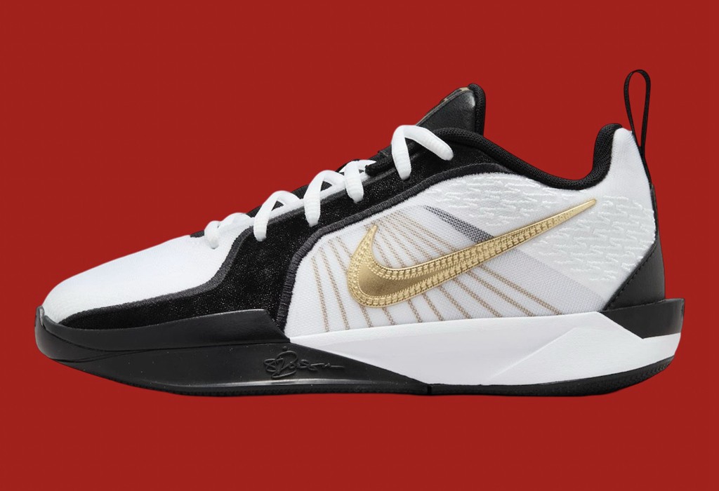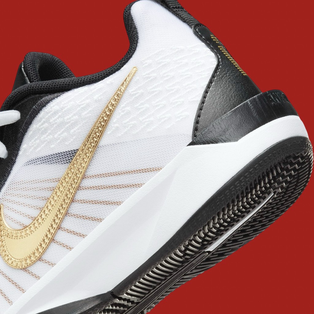 第二双以经典的黑白组合呈现,Swoosh 则点缀亮眼金色,包括鞋舌部分也是金色,更加有 Kobe 5 的味道。