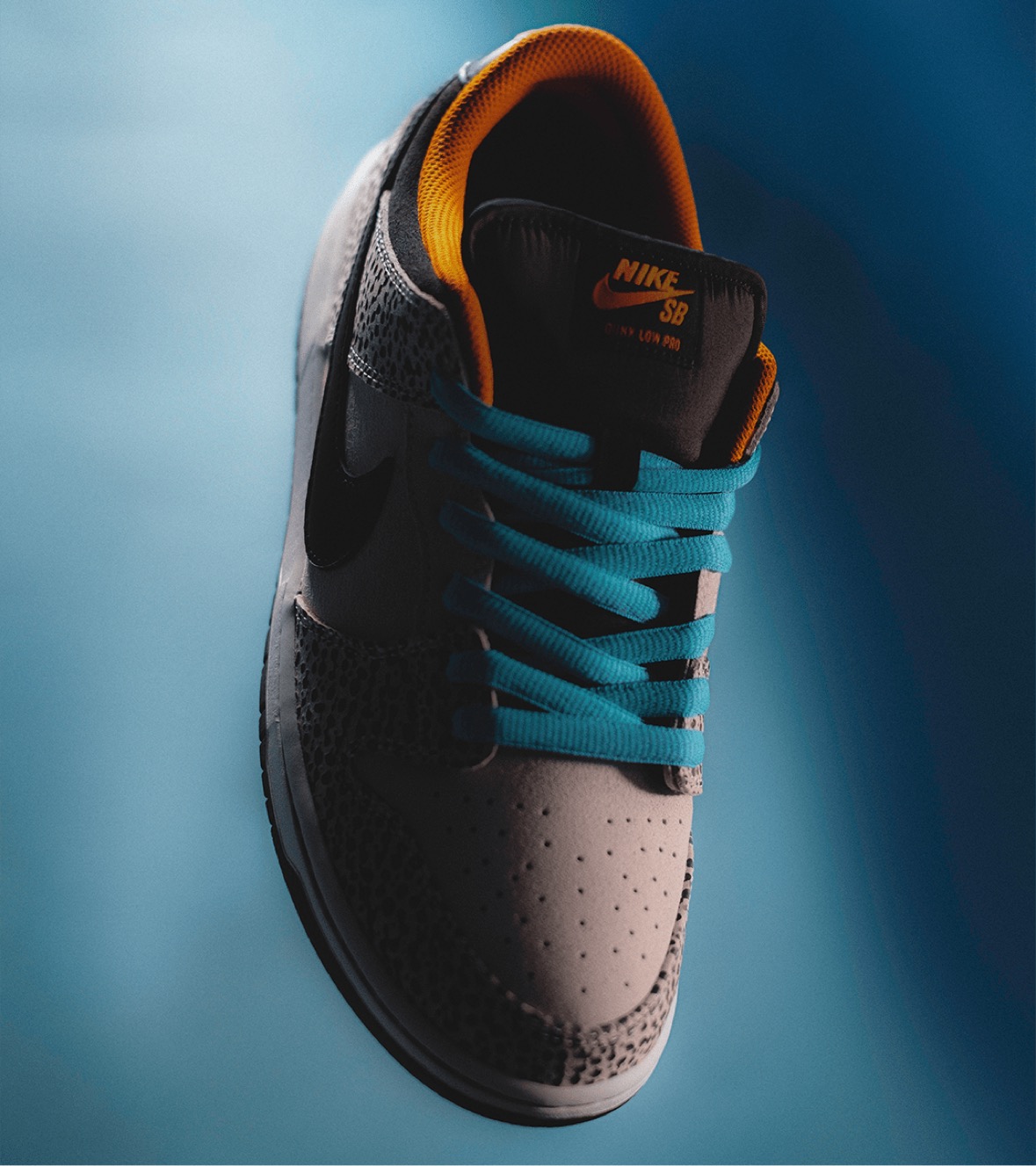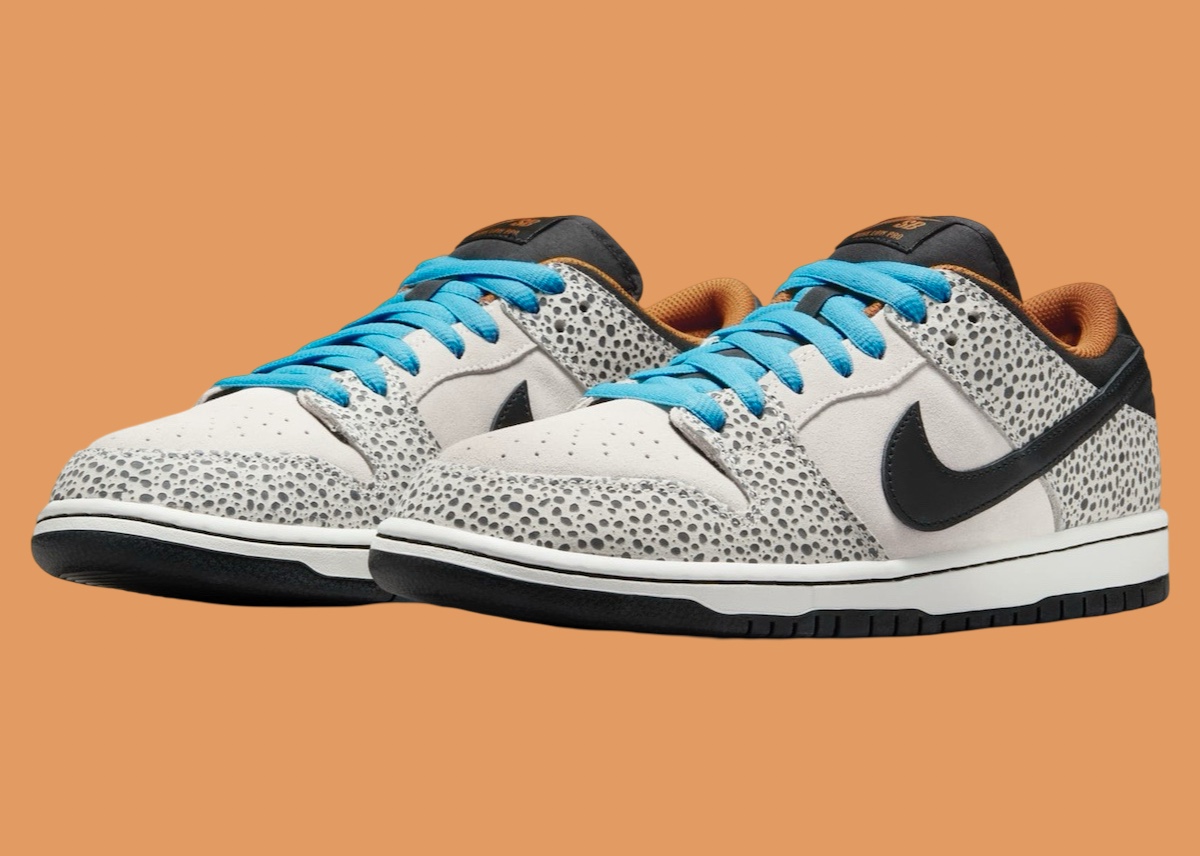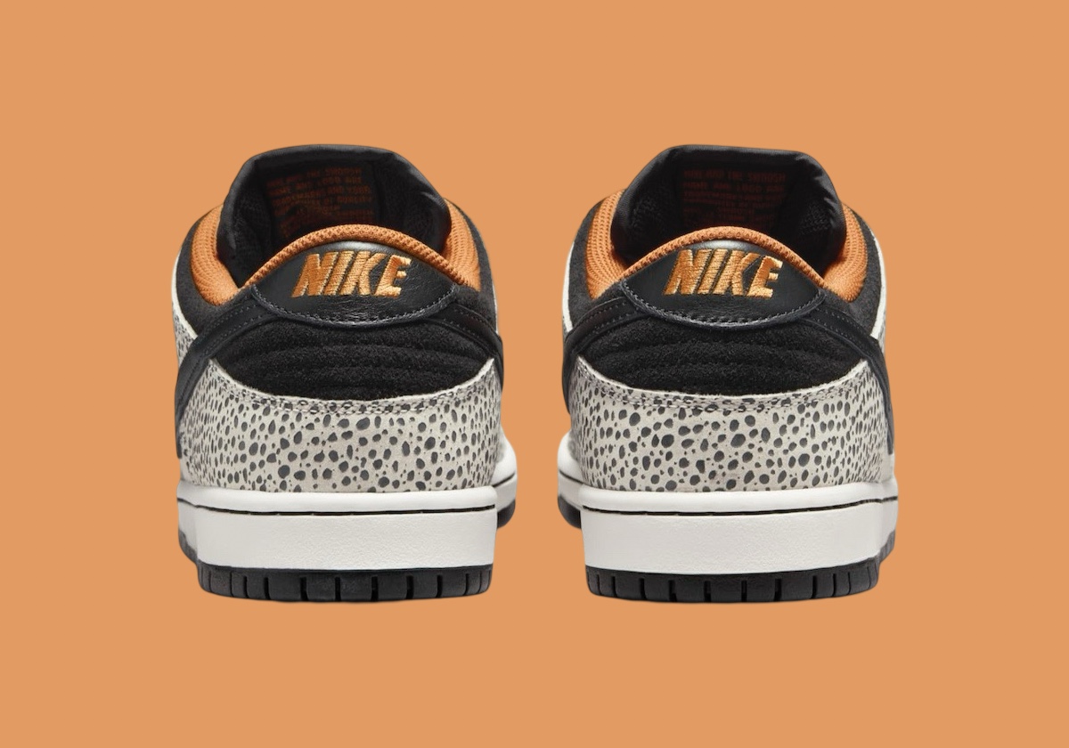 灰白色调的鞋身框架融入极具辨识度的 “Safari” 鸵鸟皮纹理,亮眼的橙色点缀内衬和外底中足细节。
