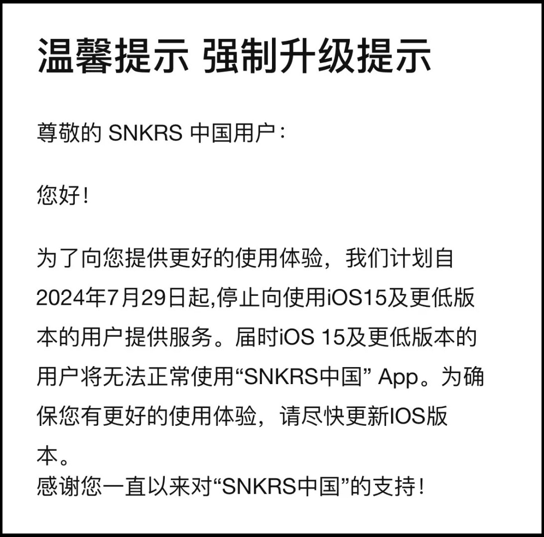 上个月中旬,国区 SNKRS 迎来一波 “强制升级” 公告,淘汰了过于老旧的设备,必须要升级到 iOS 16 以上才能正常参与抽签。