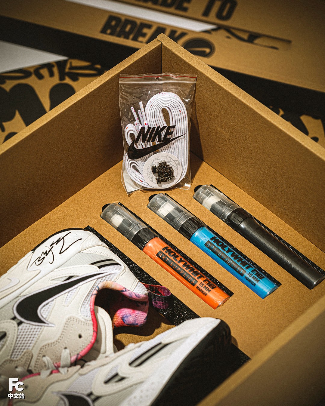 随鞋附赠彩色马克笔,可以任意在纸板上进行涂鸦,跟随鞋带一起装在袋子里的,还有 Futura 涂鸦银色胸针。