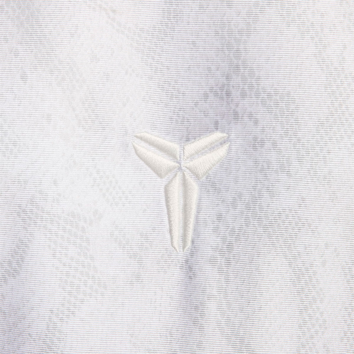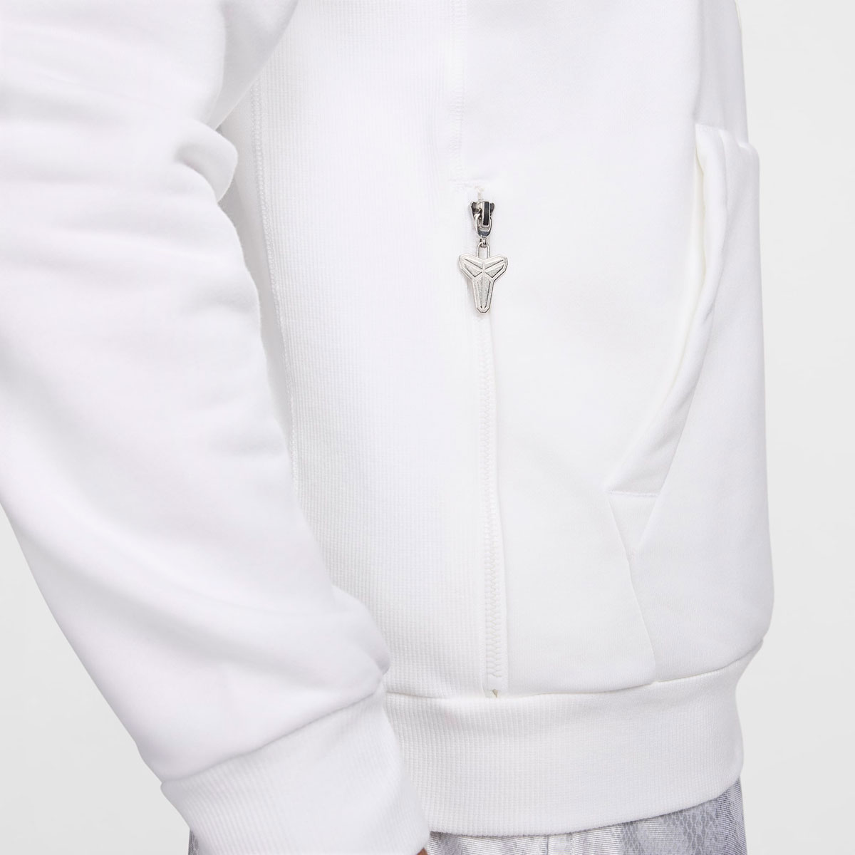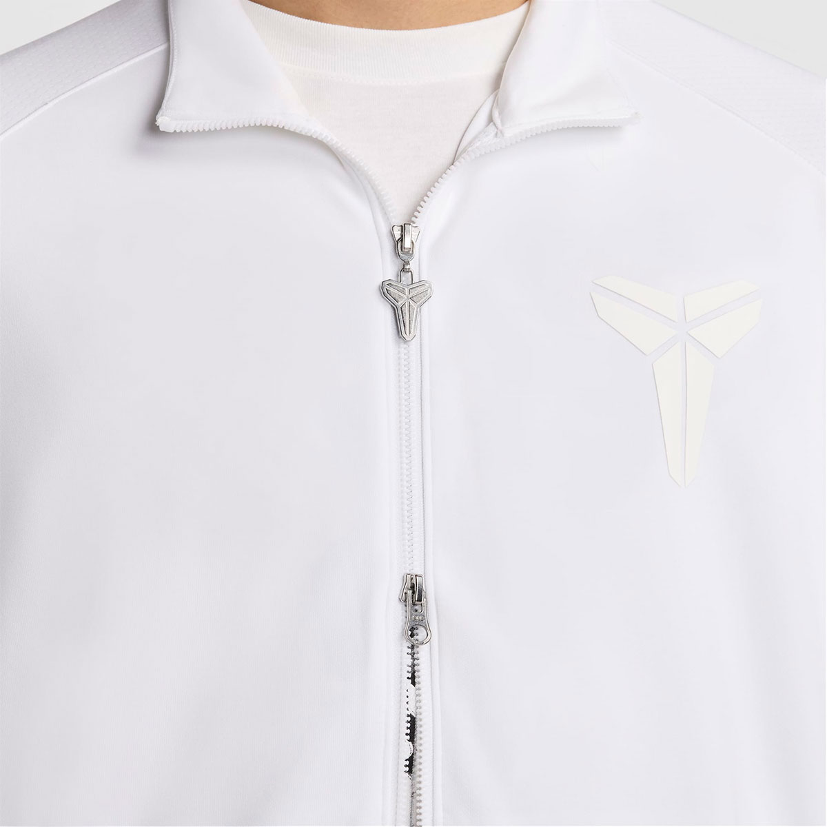 整体均以象征纯洁的「Halo」标志性浅色系营造,胸部蛇纹徽章、刺绣、拉链扣等细节,辅以科比武士 Logo 点缀。