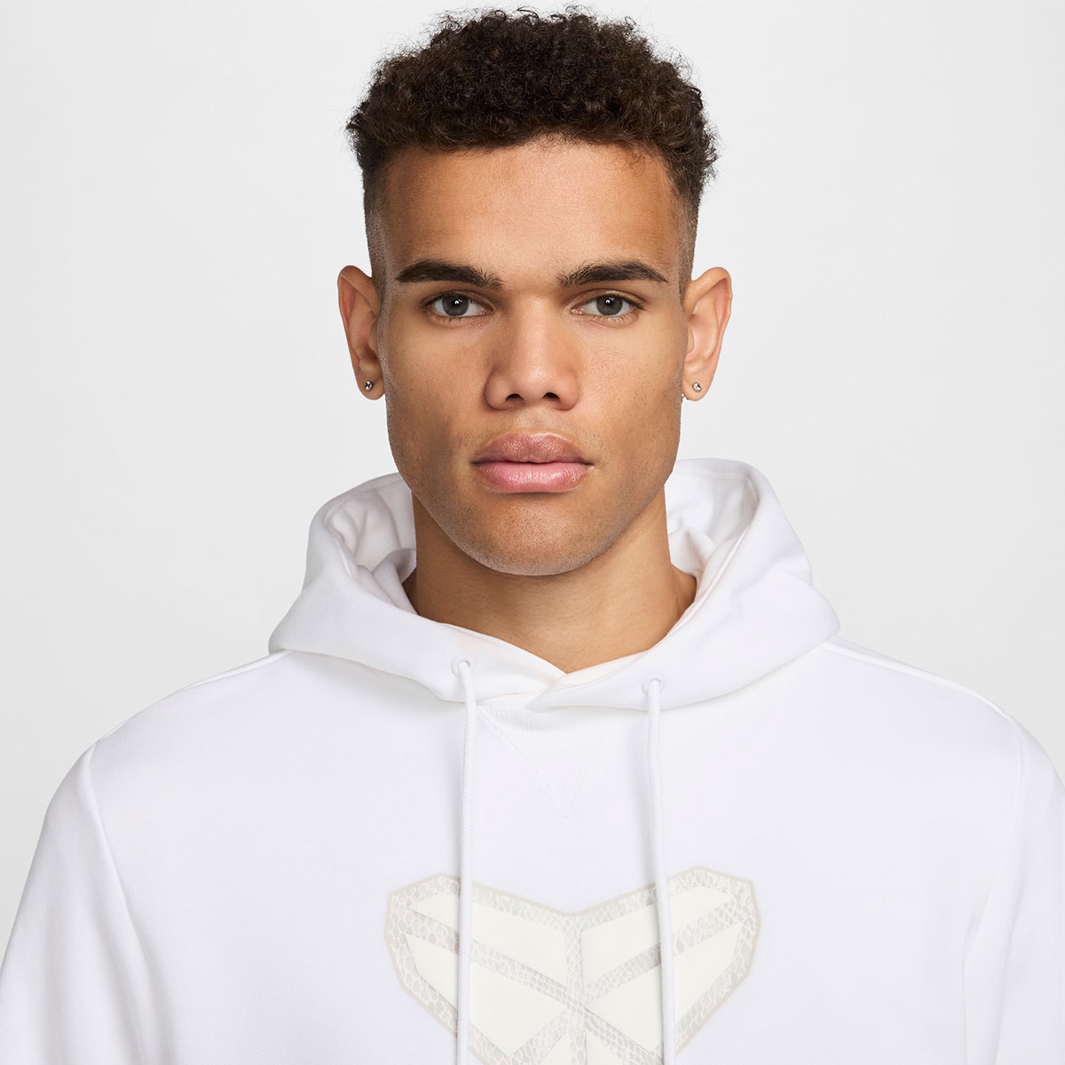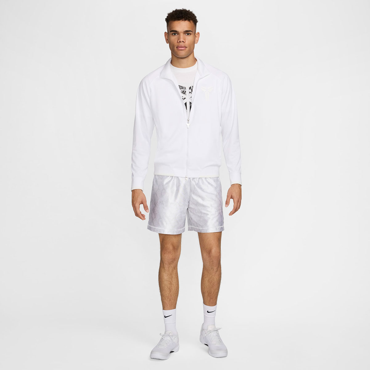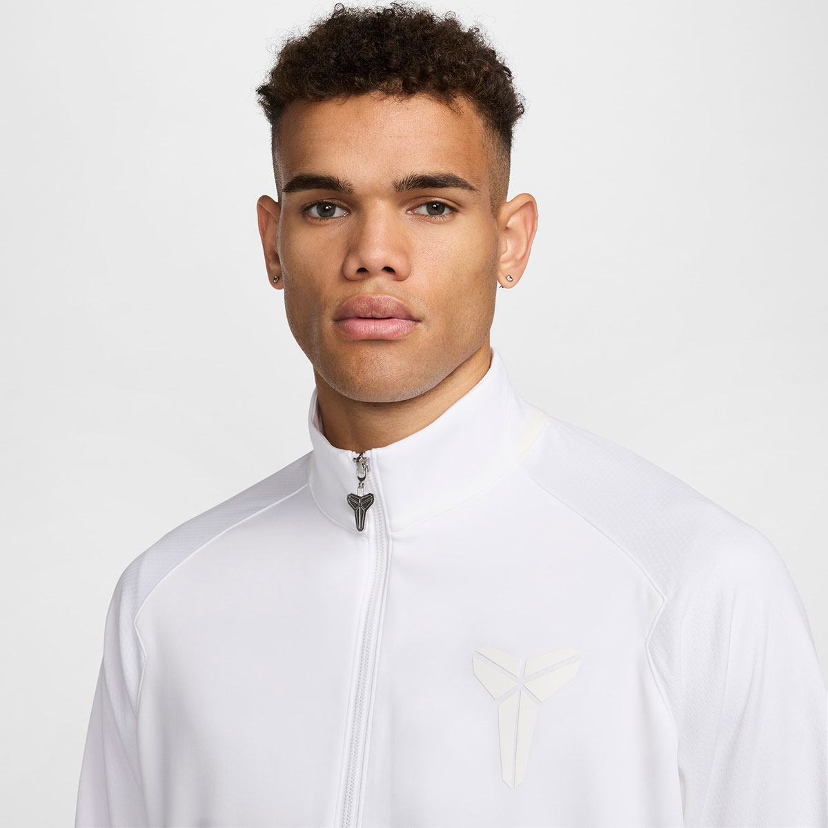 整体均以象征纯洁的「Halo」标志性浅色系营造,胸部蛇纹徽章、刺绣、拉链扣等细节,辅以科比武士 Logo 点缀。