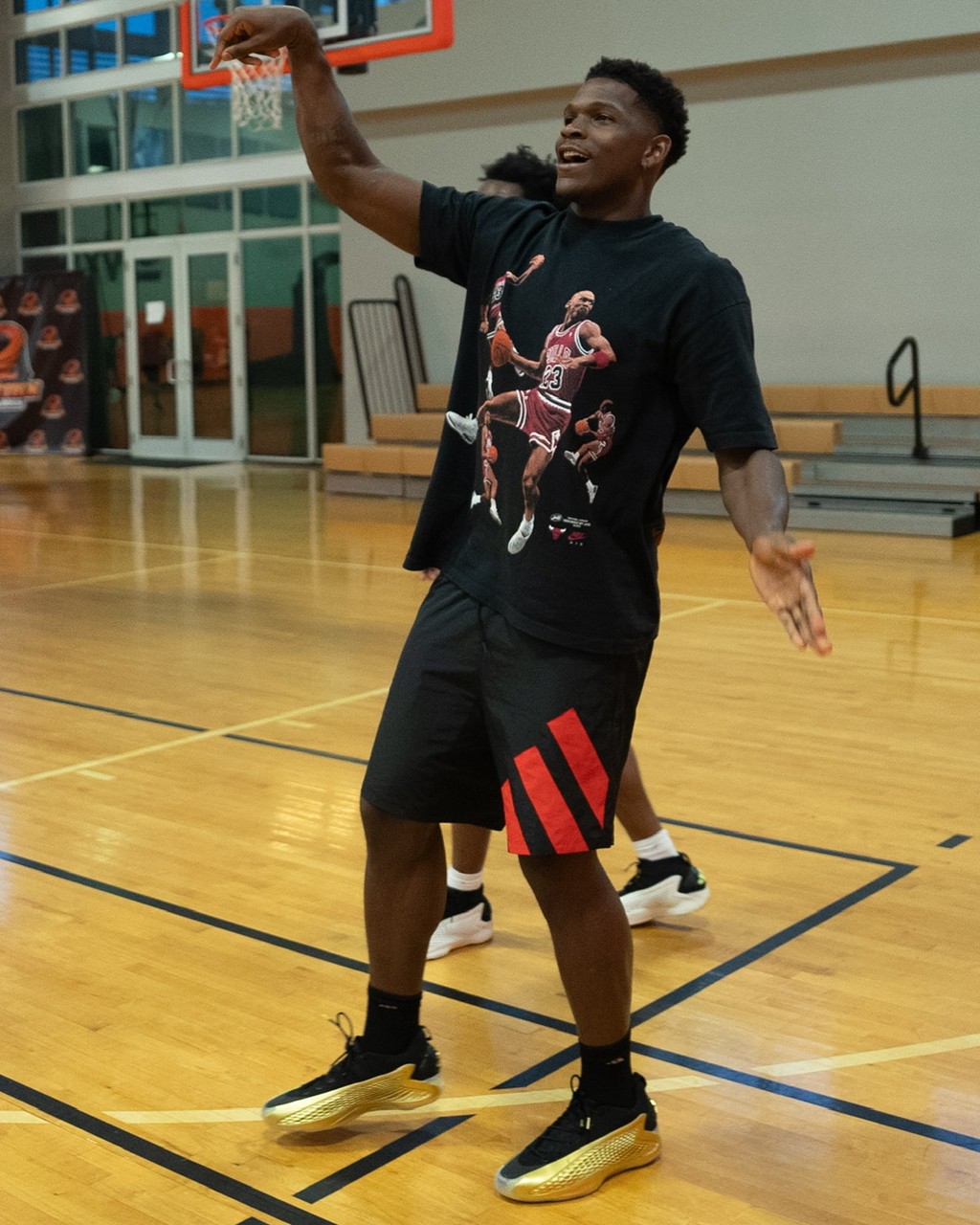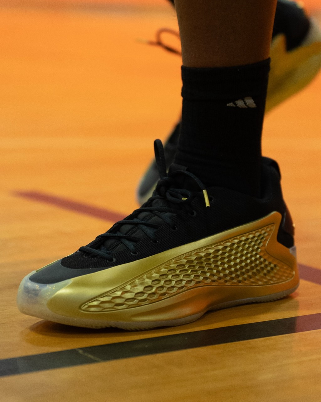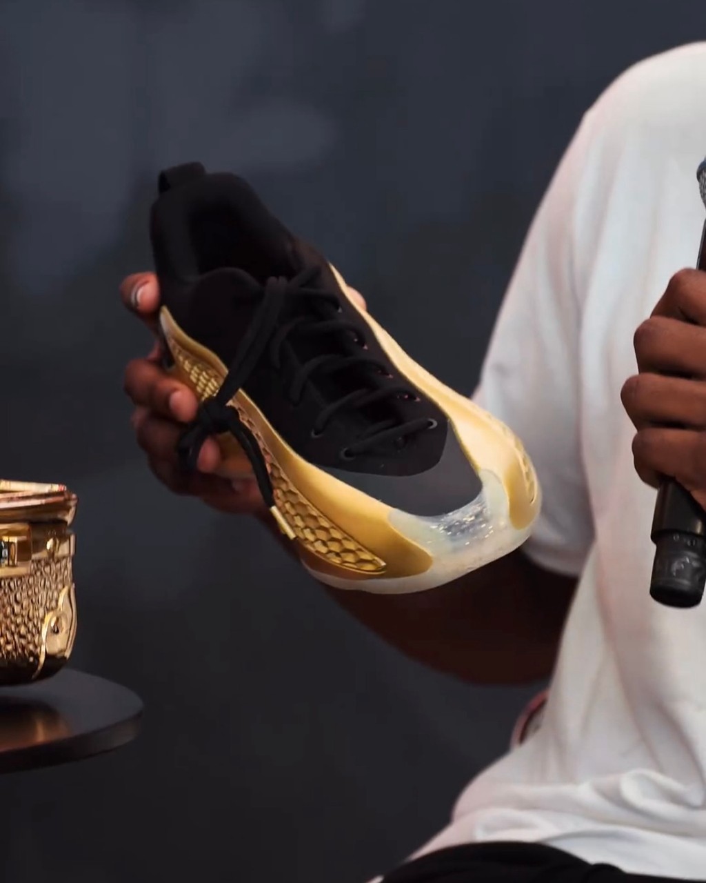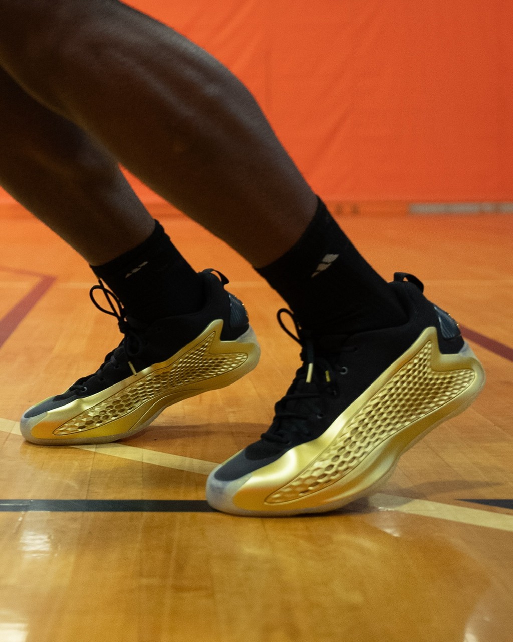 就在华子回到美国的第一次训练上,他就换上了这双独一无二的金牌 AE1。