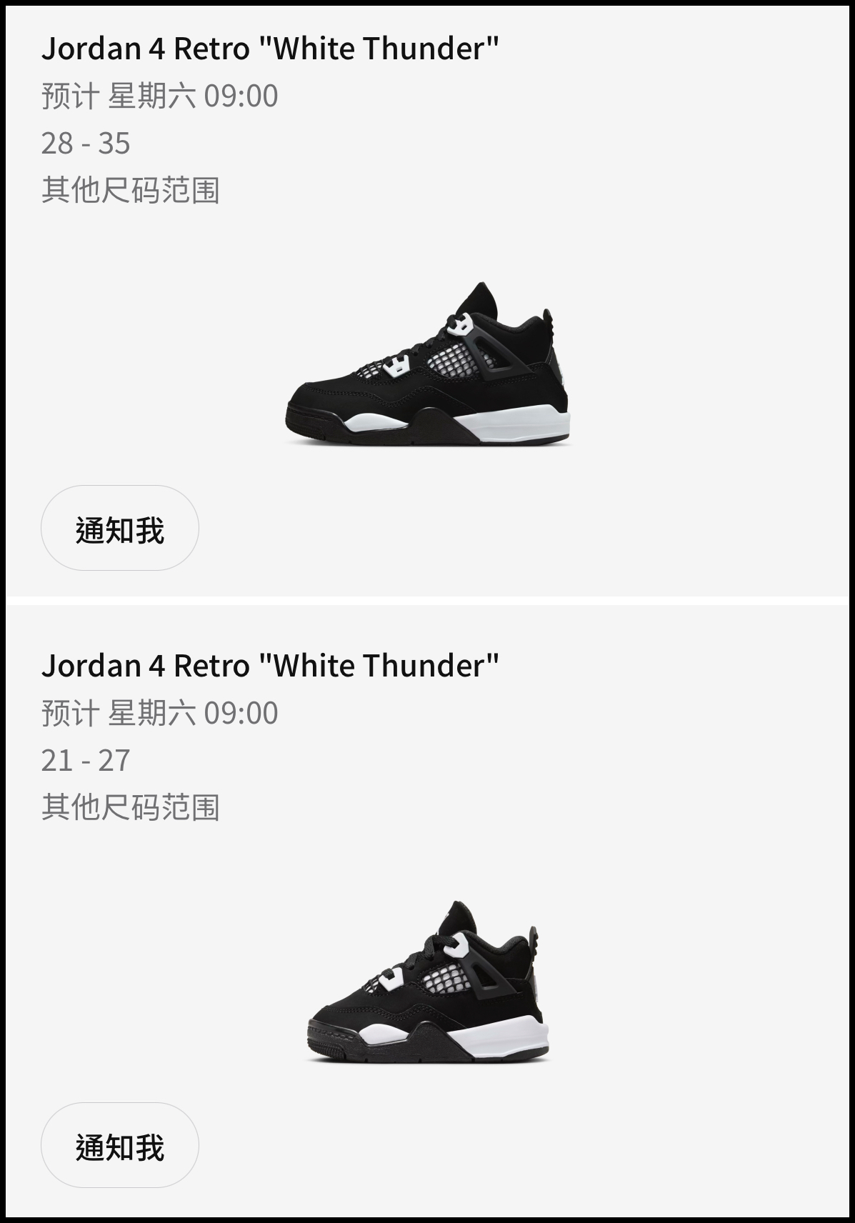 曝光多时的「白雷公」AJ4 国区SNKRS 定档本周六上午,昨天已经放出了一波专属,各位兄弟有收到提醒吗?