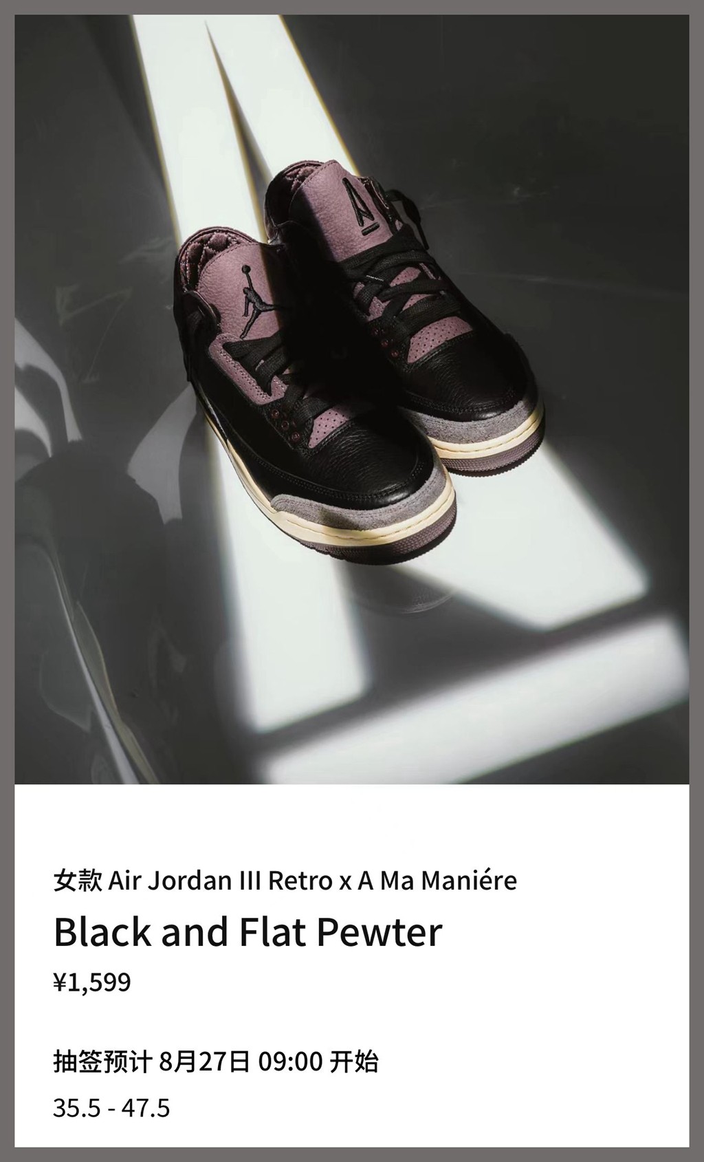 曝光许久的这双 A Ma Maniére x Air Jordan 3 “Black” 终于定档,目前国区 SNKRS 已经正式上架预告。