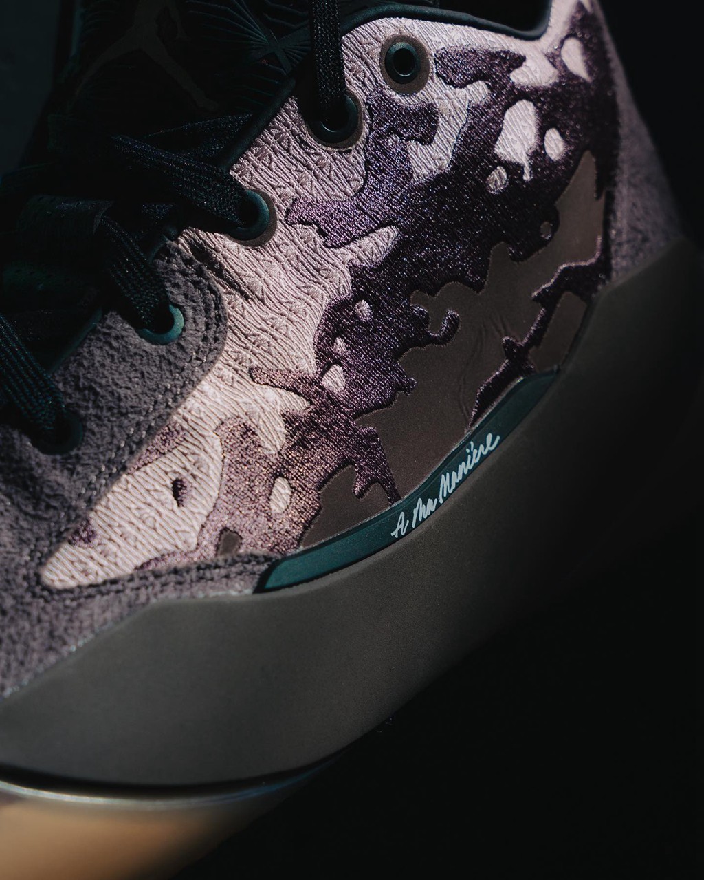 足弓一侧标志性的 TPU 上点缀小小的 A Ma Maniére 手写字体,精致感拉满,仔细看会发现,浅色部分都是 A 字 Logo 暗纹。