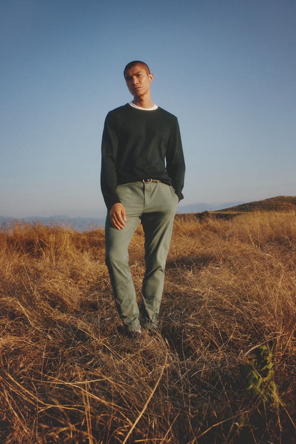 New Venture 圆领毛衣,叠穿 Zeroed In 短袖 T 恤,下身搭配采用速干面料、具有四面弹力的 ABC 修身剪裁长裤,感受全天舒适。