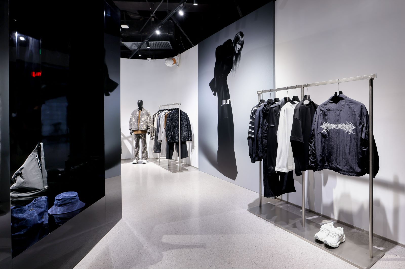 在这次的限时空间中,Juun.J 展现了其全新的空间设计理念。以“New Black”为主题,将品牌的标志性黑色与光滑、高光材质巧妙结合,营造出一个既时尚又充满活力的空间环境,完美诠释了 Juun.J 年轻而充满活力的品牌精神。
