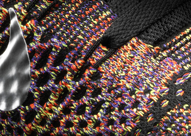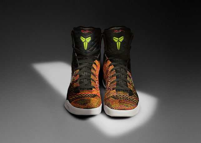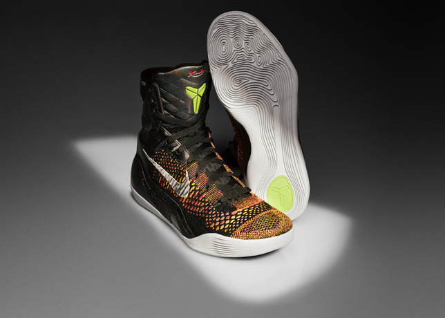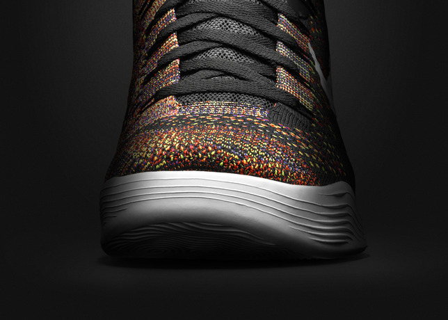 Nike Kobe 9 Elite “Masterpiece” 酷黑纹理衬托下的五彩 Flyknit 编织鞋面及动态 Flywire 飞线,细看几乎每根线都是不同颜色,让人印象深刻。